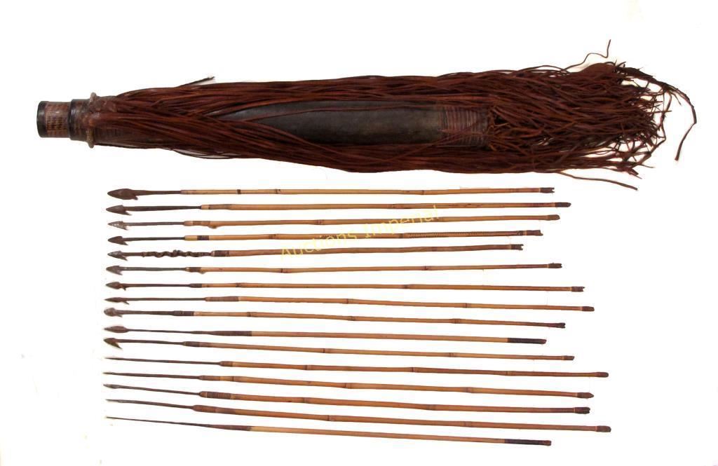 Hausa People, with characteristic cylindrical leather body, elaborately embellished with tooling in geometrical motifs, dyeing, and applied woven strips together with lengthy fringed tassels, lizard skin and a baldric. Containing 16 reed arrows with barbed steel tips and rawhide-bound nocks. Early 20th century. Light wear. Overall length 67 cm.