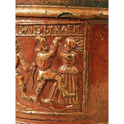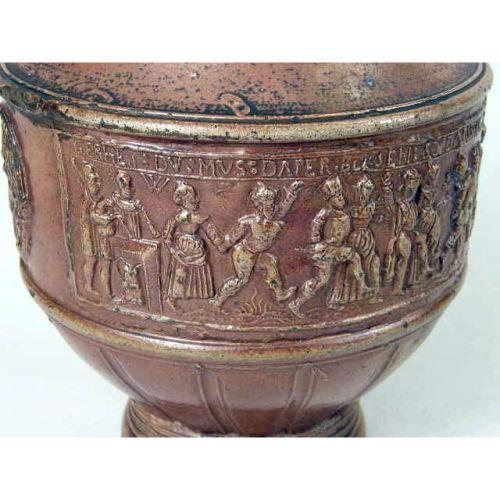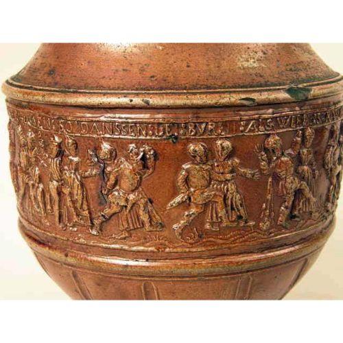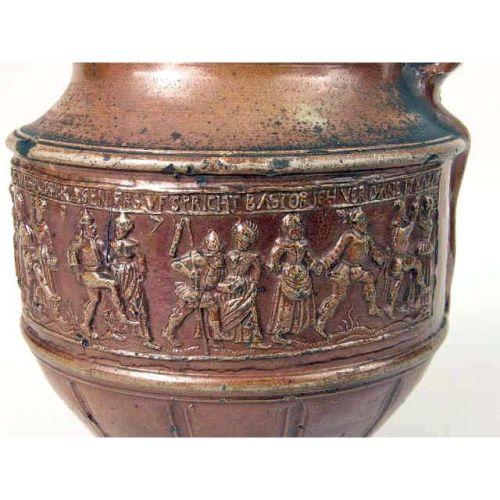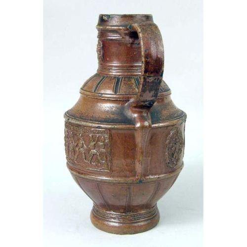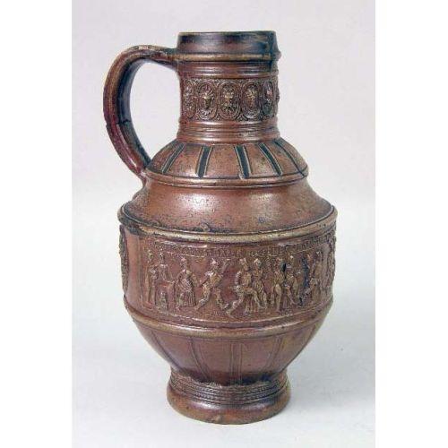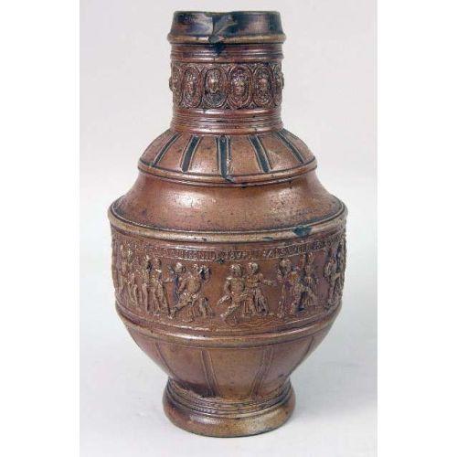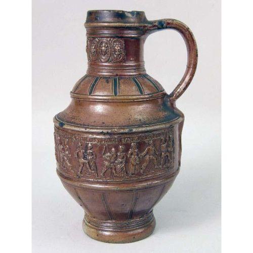 A WESTERWALD GLAZED STONEWARE JUG<BR><BR>German, losses and repair to handle, 10-1/2"h
