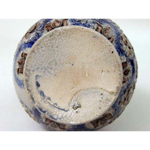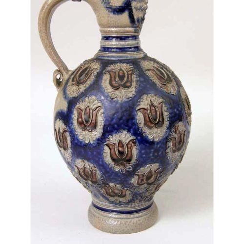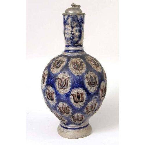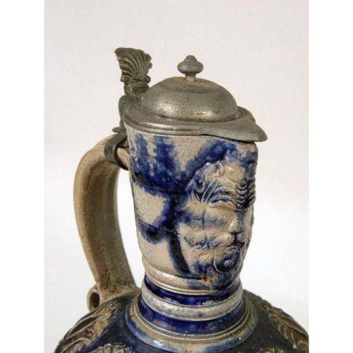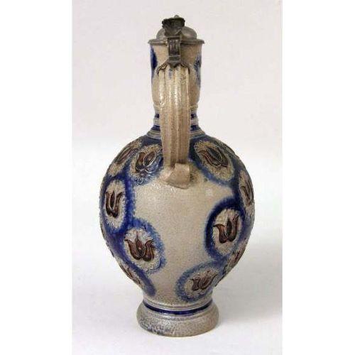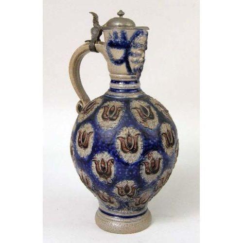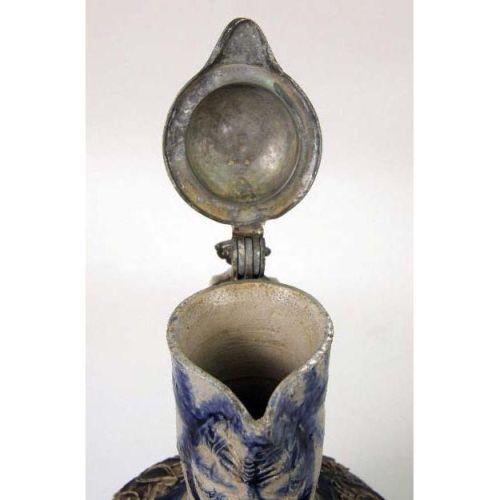 A WESTERWALD PEWTER-MOUNTED COBALT-DECORATED STONEWARE JUG<BR><BR>German, the spout decorated with a mask, 11-3/4"h