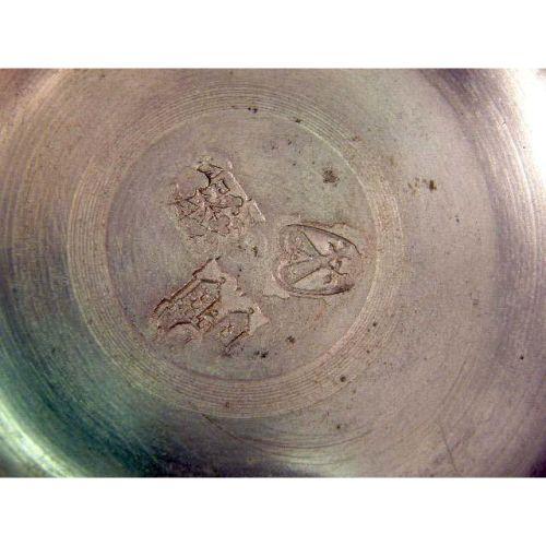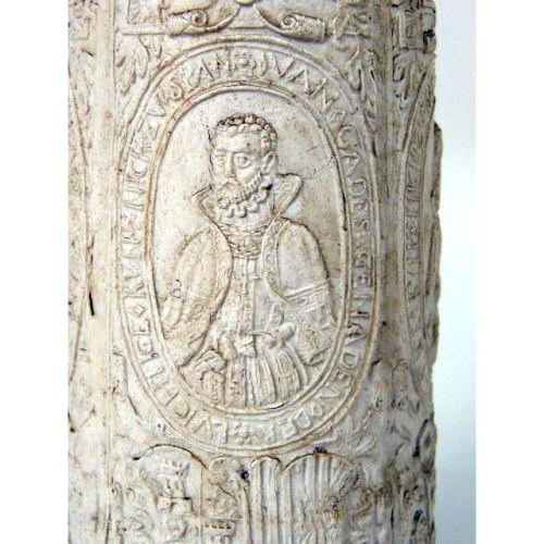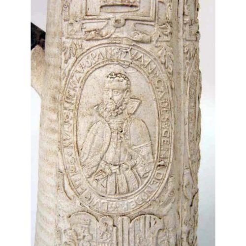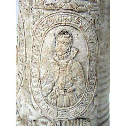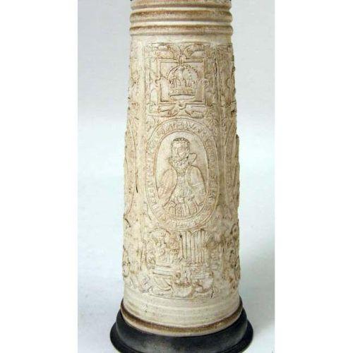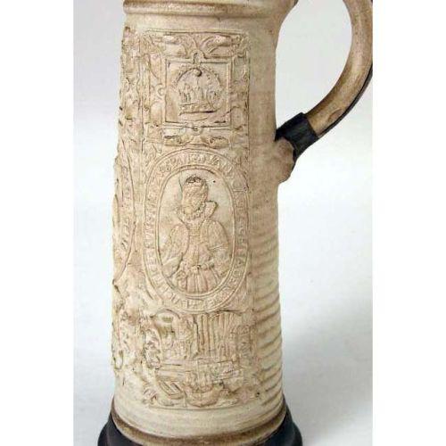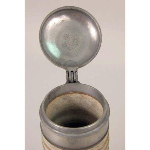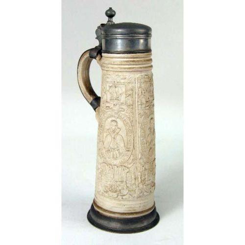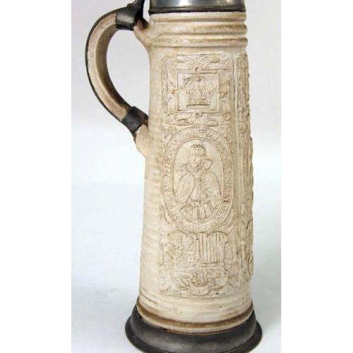 A WESTERWALD PEWTER-MOUNTED STONEWARE TANKARD<BR><BR>German, the lid with hallmarks and bearing the initials "BHR" and the date "1681". Minor chips, pewter foot possibly later, 11-1/2"h