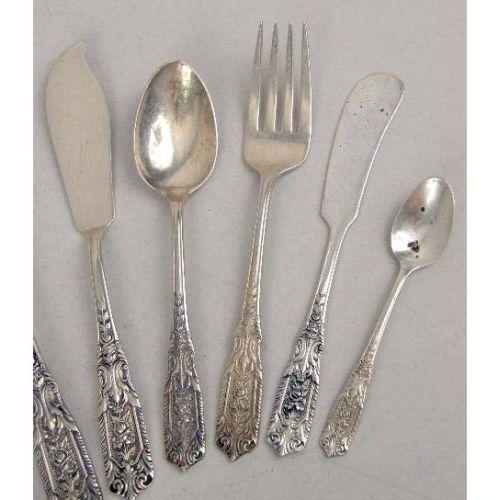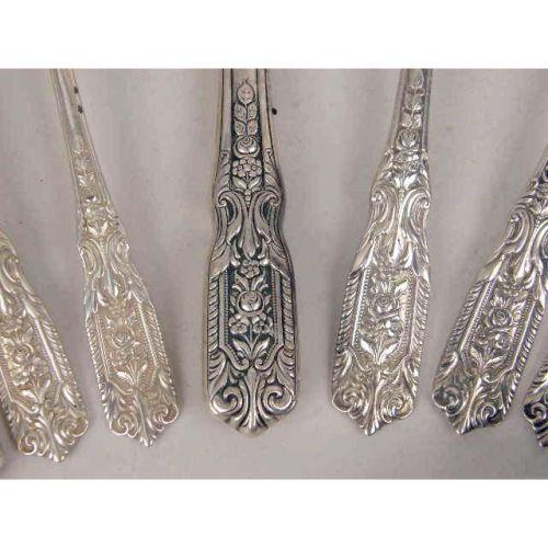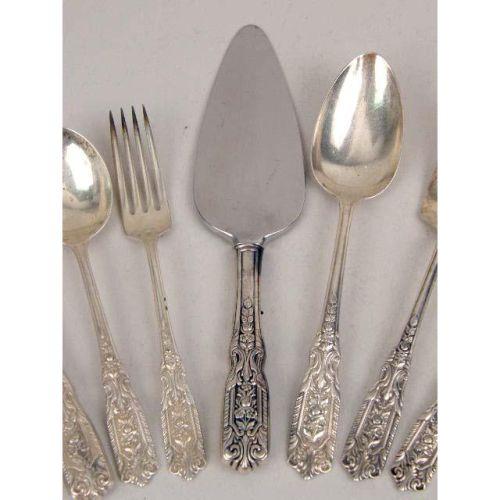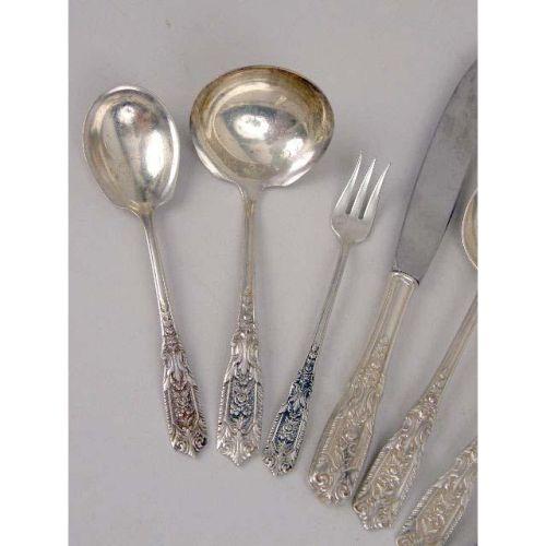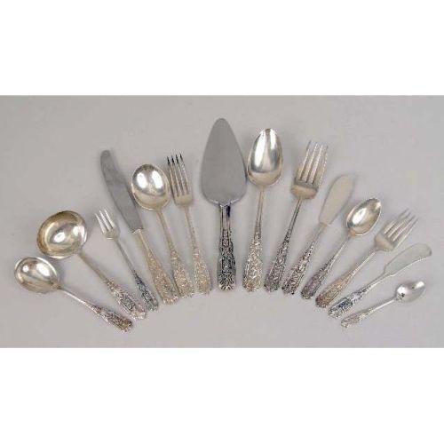 A WESTMORLAND STERLING SILVER PARTIAL FLATWARE SERVICE<BR><BR>Comprising nine each, dinner knives and forks, cream soup spoons, flat-handled butter spreaders, teaspoons, thirteen salad forks, eight seafood forks, five demi-tasse spoons, one cake server, one sauce ladle, one master butter spreader, one cold meat fork, and one sugar shell, together with two dinner knives of a different pattern