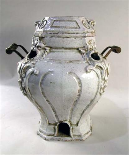A WHITE GLAZED FAÏENCE STYLE DOUBLE HANDLED DIMINUTIVE STOVE; 21"H