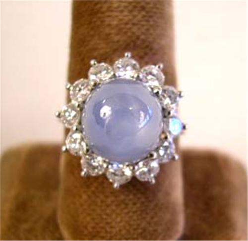 A WHITE GOLD WITH CENTER STAR SAPPHIRE SURROUNDED WITH DIAMONDS RING;