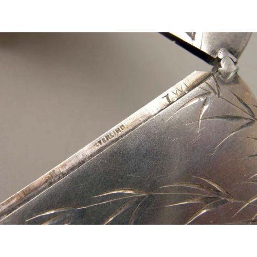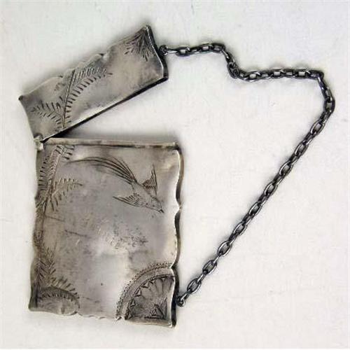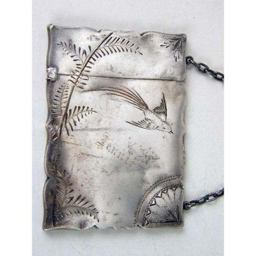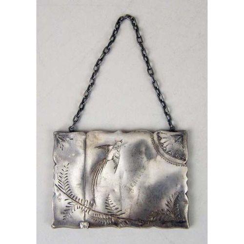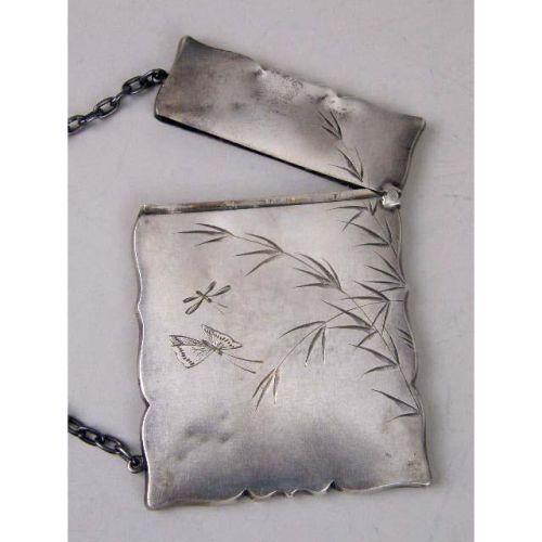 A WHITING STERLING SILVER HINGED LID CARD CASE ON CHAIN<BR><BR>Japanesque motif with engraved name, 3-1/2" x 2-1/2"