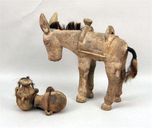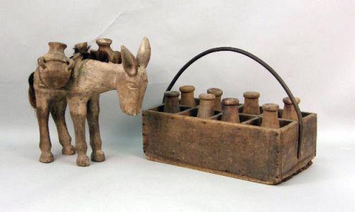 Together with a carved wood donkey carrying two jugs. 6 1/2"h x 19 1/2"w to 15"h