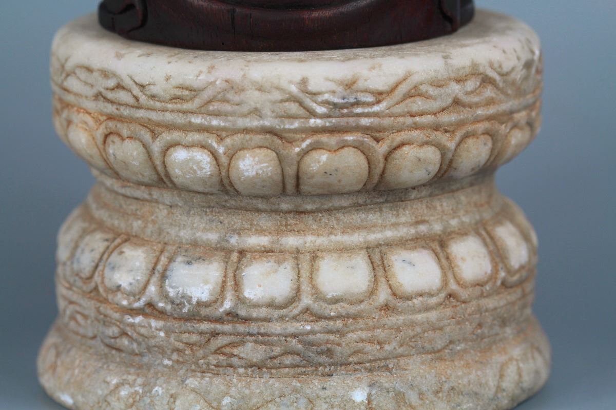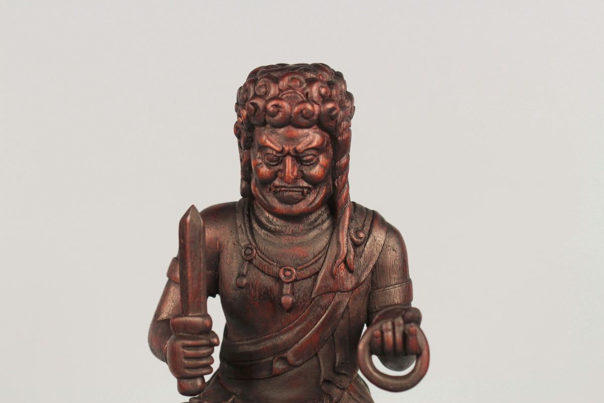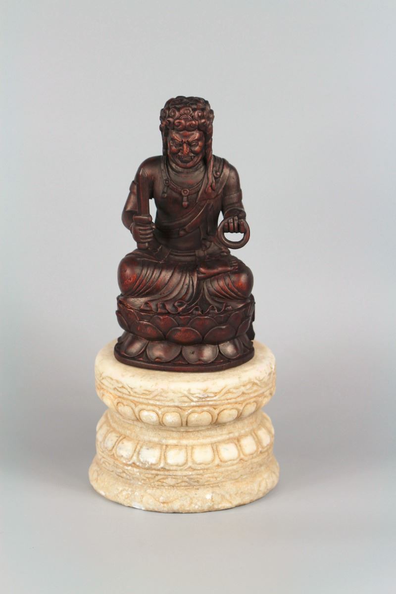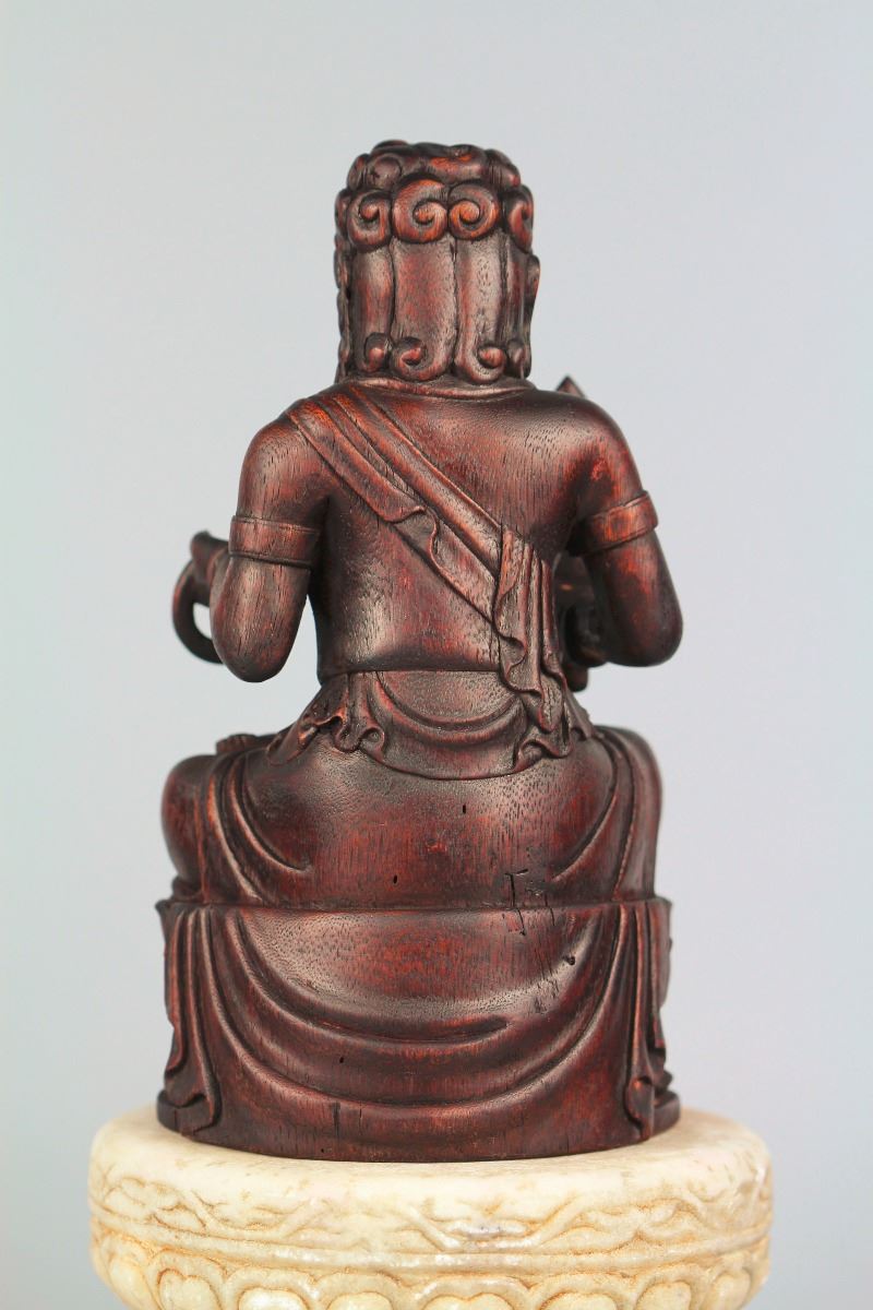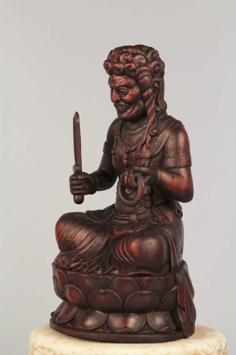 A wood statue of seated Rohan, seated on a lotus crown with one hand holding a instrument and the other holding a sword, a jade lotus base underneath the crown enhances the dignified power of his. Height 7.5" (without the base)