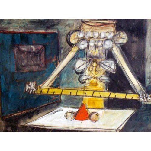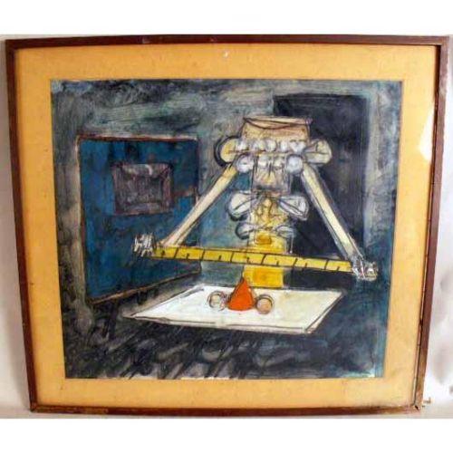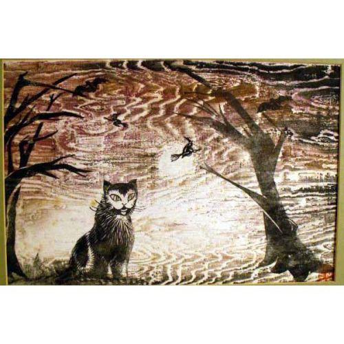 A WOODBLOCK PRINT<BR><BR>Depicting a Halloween scene in the Chinese tradition, bears signature lr Clement Hurd. Together with a mixed media abstract titled on the verso "The Pea Game". From 10"h x 15"w to 14 1/2"h x 16"w. 2 pieces.