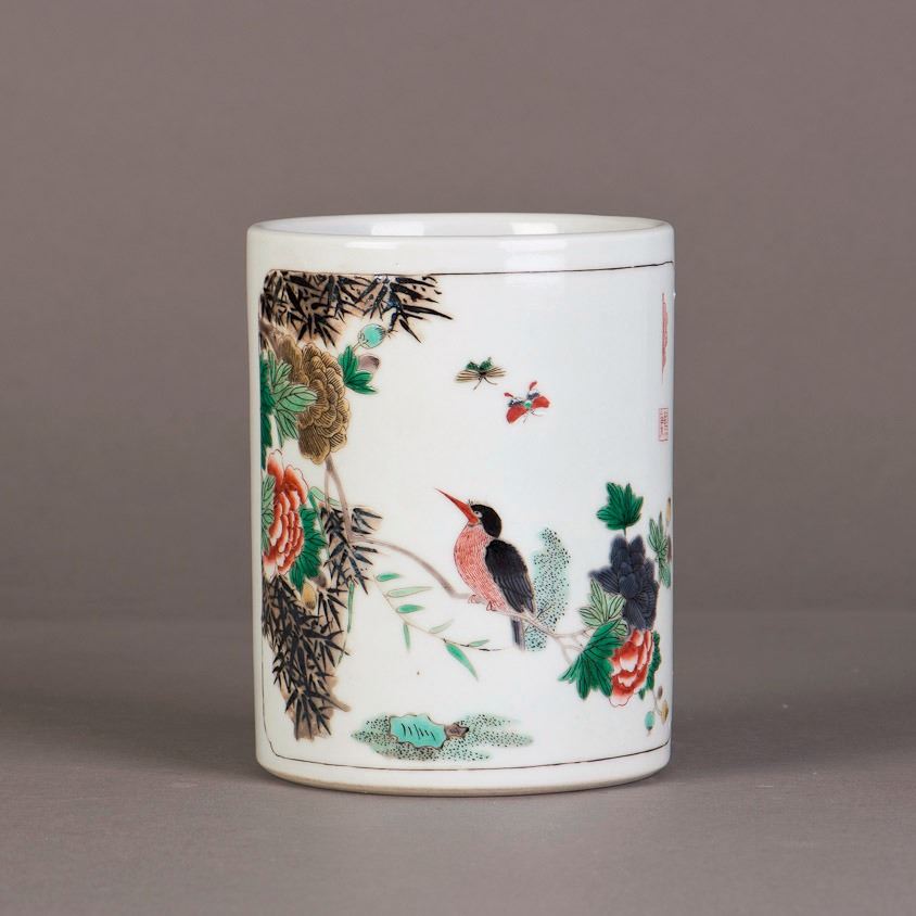 A wucai porcelain brush pot in cylindrical form, featuring vivid painting of flower blossoms, avain and insects in harmony, bearing a red seal on the side. Height 5.75" Width 4.5"