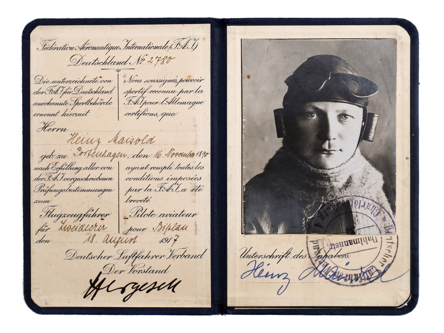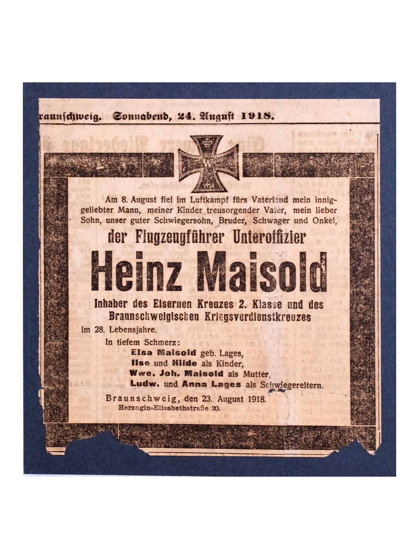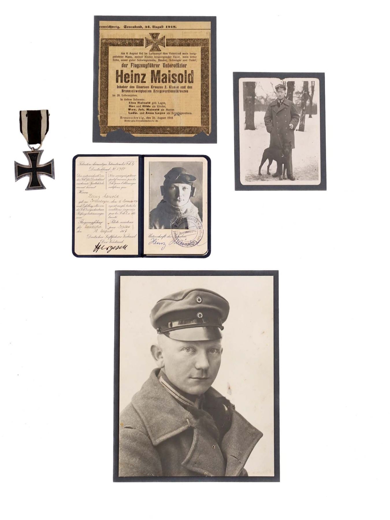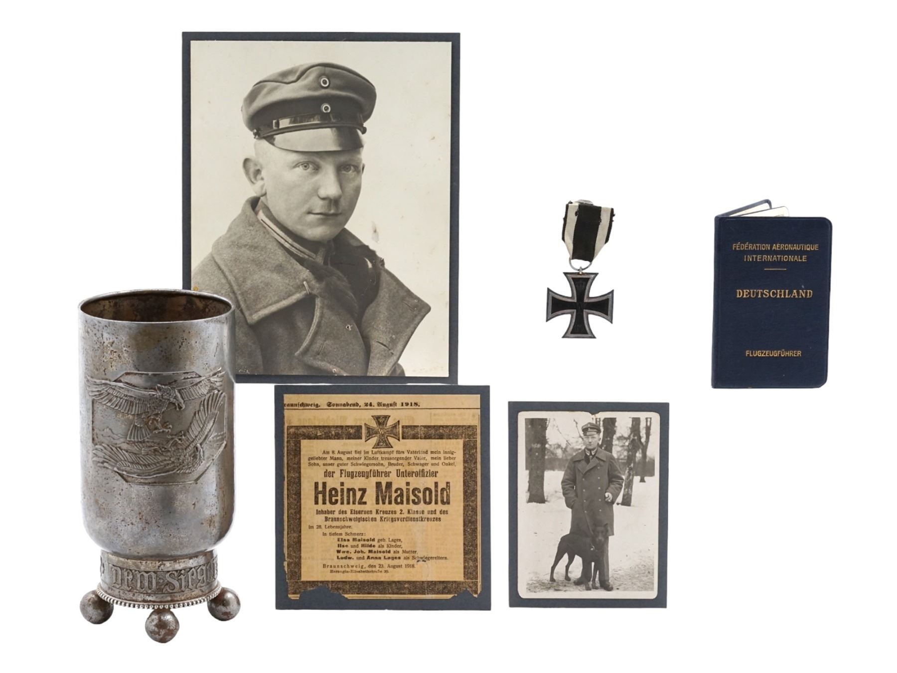 From the pilot Heinz Maisold. His Iron Goblet for 3 kills, Iron Cross Second Class, two photos, and death notice (Newspaper clip).