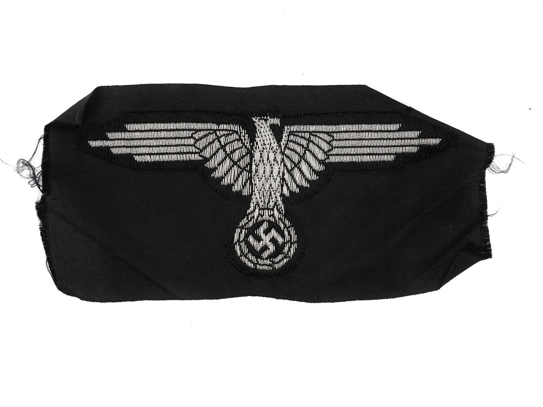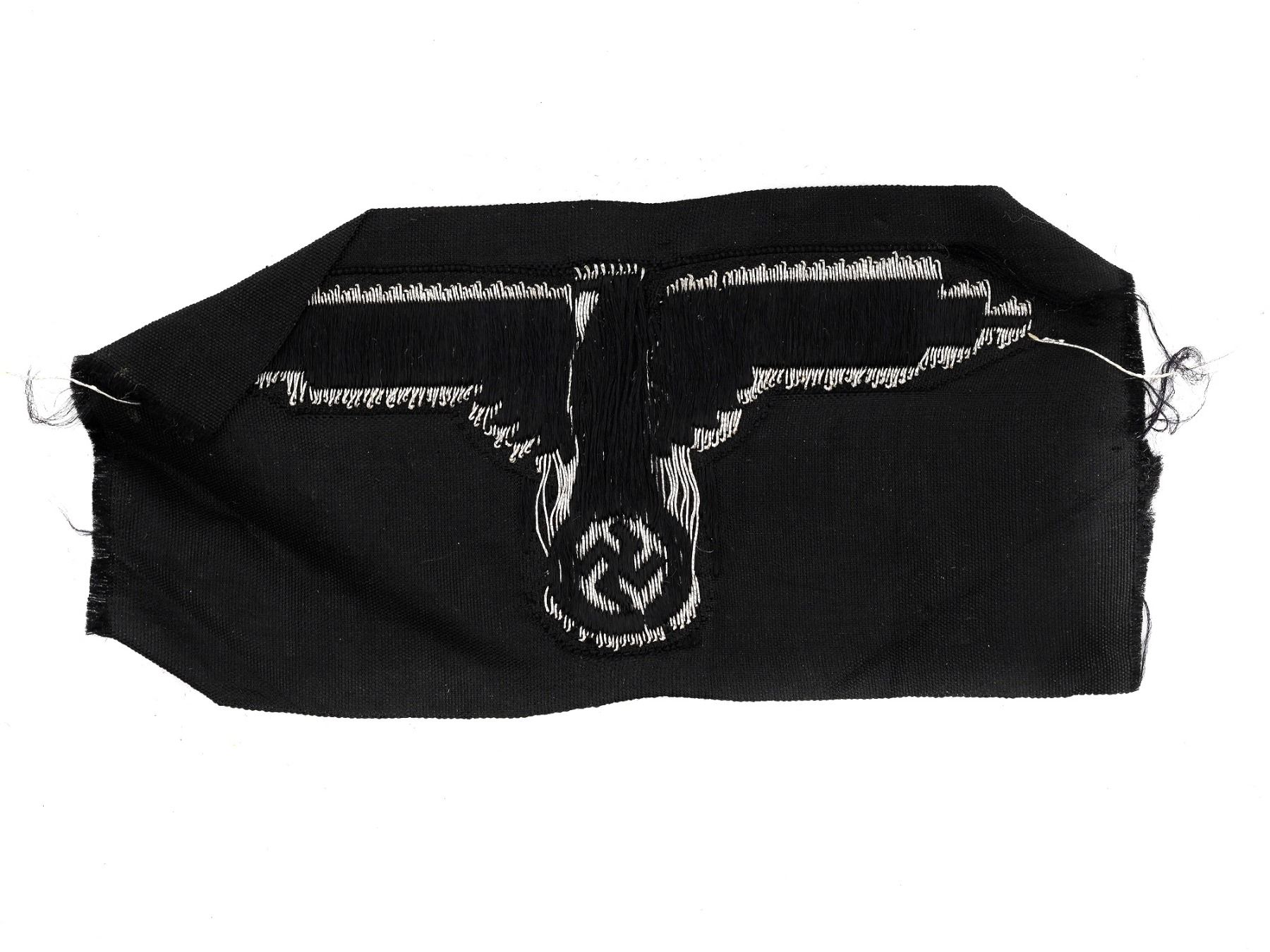 A WW2 era German patch for use on an SS tunic. The image is the characteristic 'Reichsadler' or 'Imperial Eagle' holding a wreathed swastika within its talons.