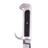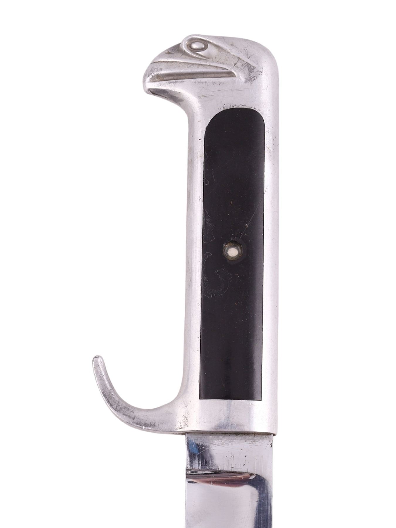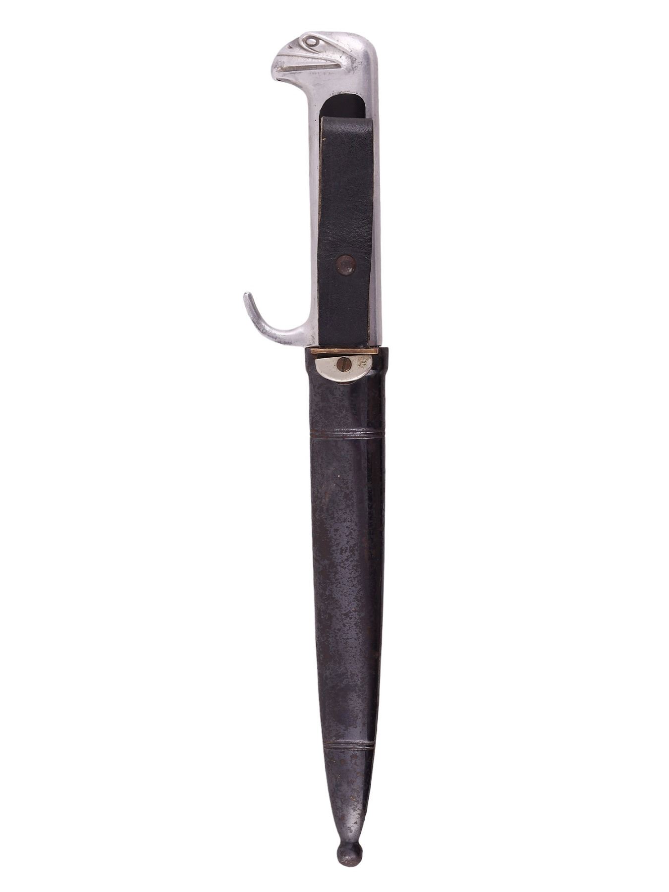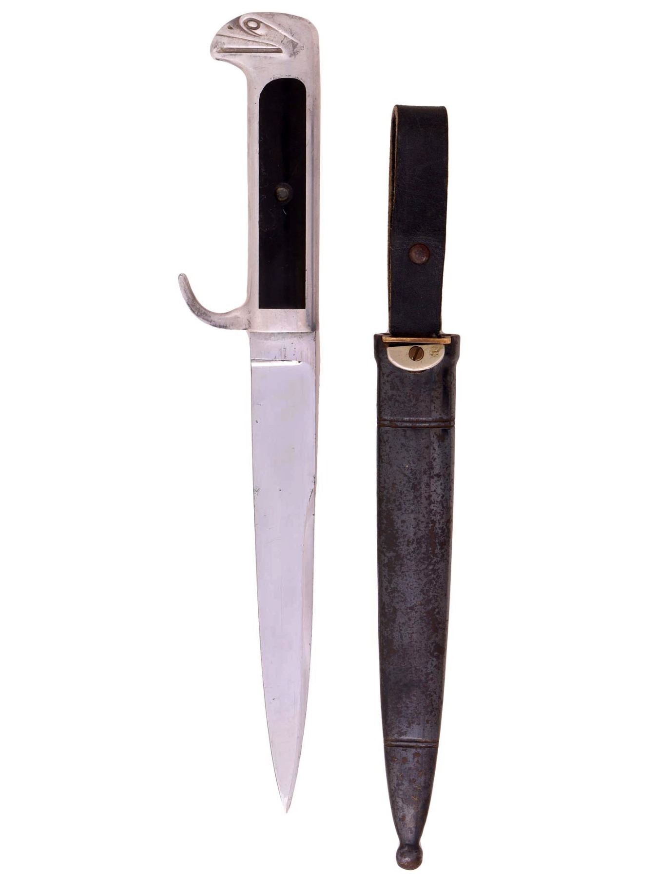 An Italian fascist Model 1932 dagger of the type worn by officers of the National Fascist Party and the Voluntary National Security Police (aka the Blackshirts). The dagger has an aluminum grip with black Bakelite inserts. The Bakelite insert on the obverse side bears the Italian fasces emblem. The blade has some small scratches and dents on the sides, with the edge itself being near perfect. The metal scabbard retains almost all of its original paint, with some mild surface rust.