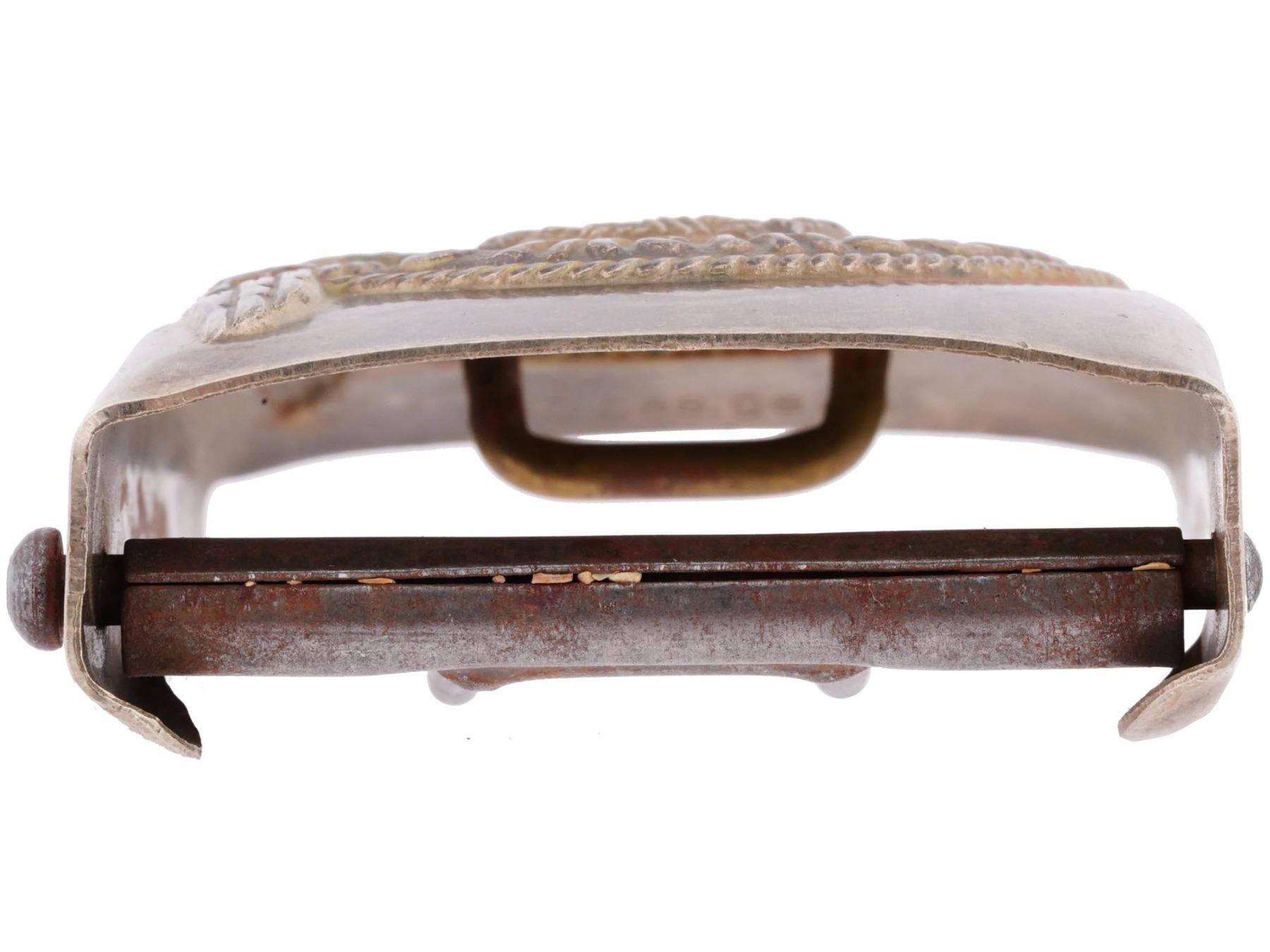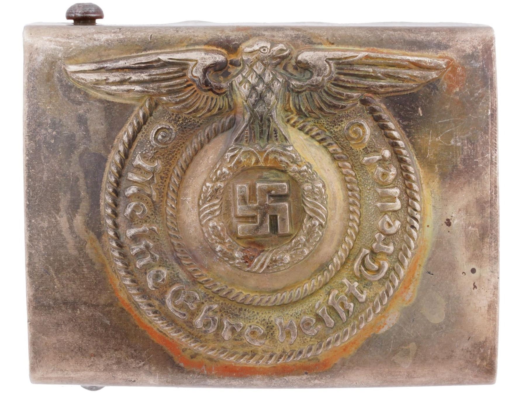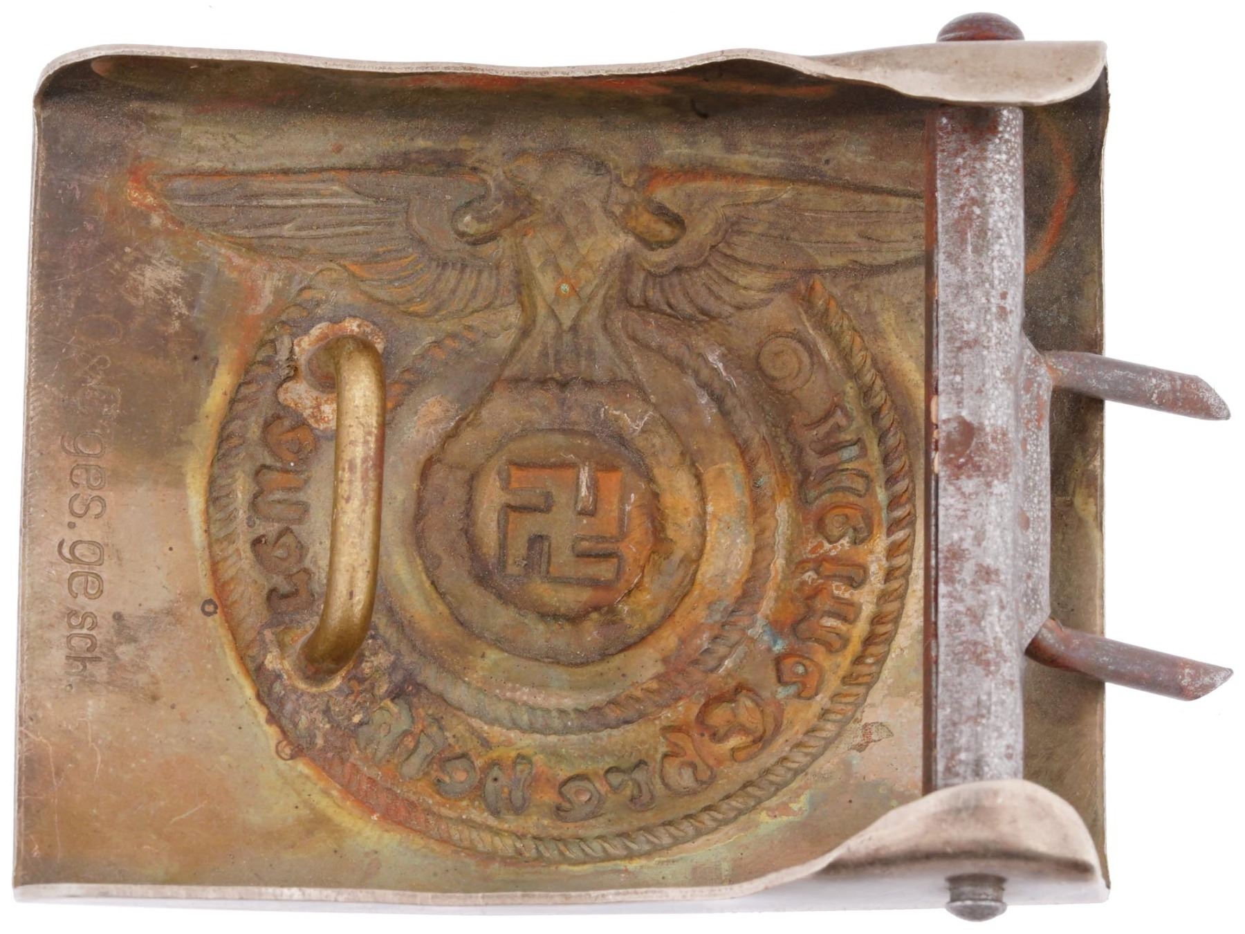 A World War II SS officer aluminum belt buckle. Square buckle with embossed depictions of the Reichsadler, swastika, and inscription Meine Ehre Heisst Treue, Loyalty is My Honour. Hallmark Ges. Gesch. is on the verso.