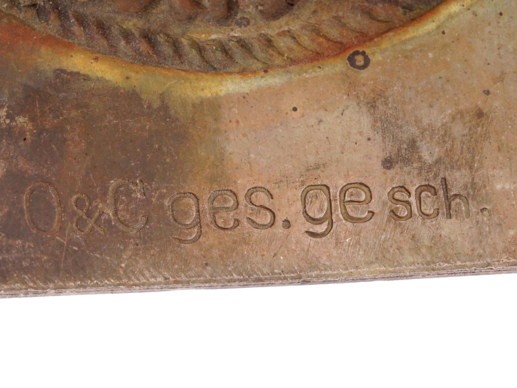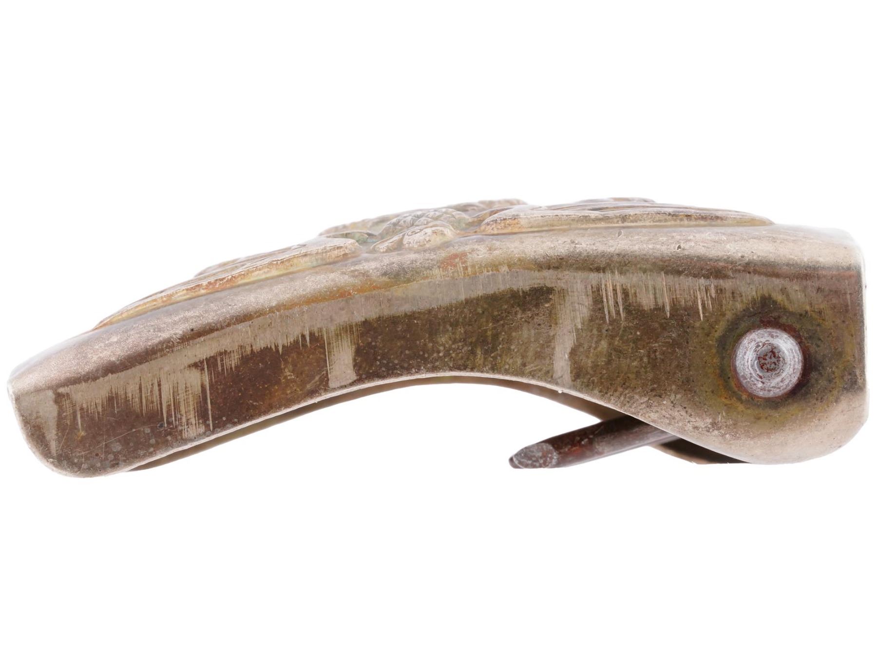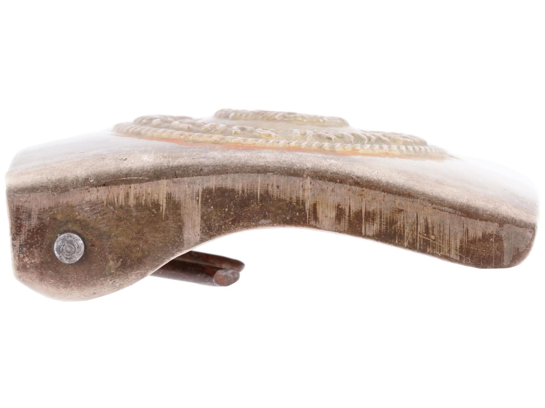 A World War II SS officer aluminum belt buckle. Square buckle with embossed depictions of the Reichsadler, swastika, and inscription Meine Ehre Heisst Treue, Loyalty is My Honour. Hallmark Ges. Gesch. is on the verso.