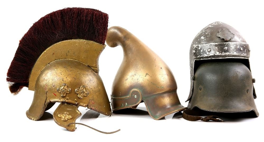 A WWII helmet, a Roman helmet and two other helmets from various productions, three with Western Cos