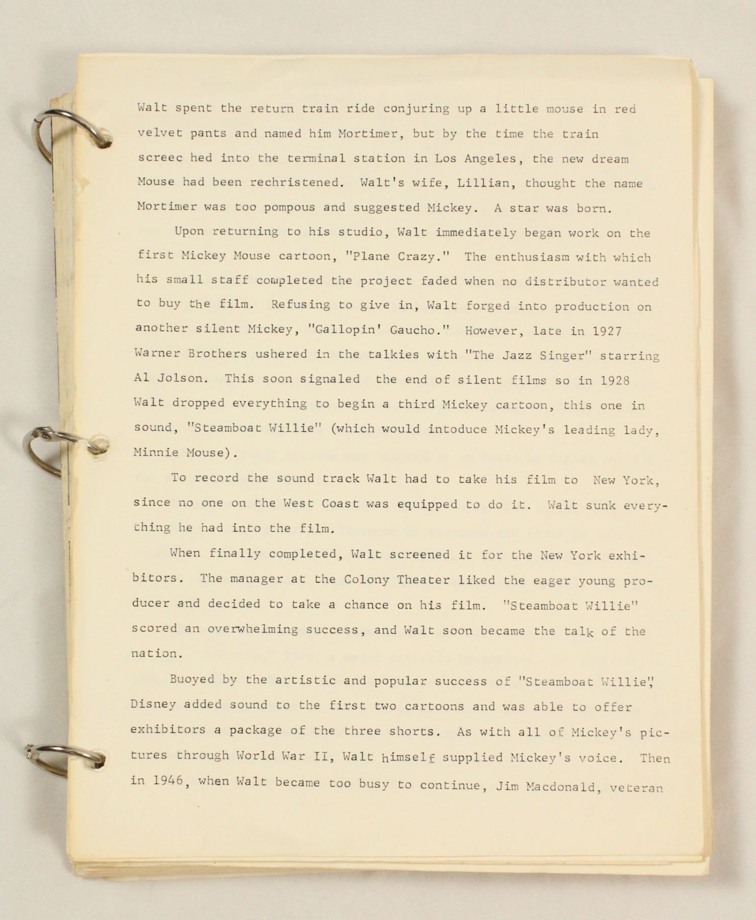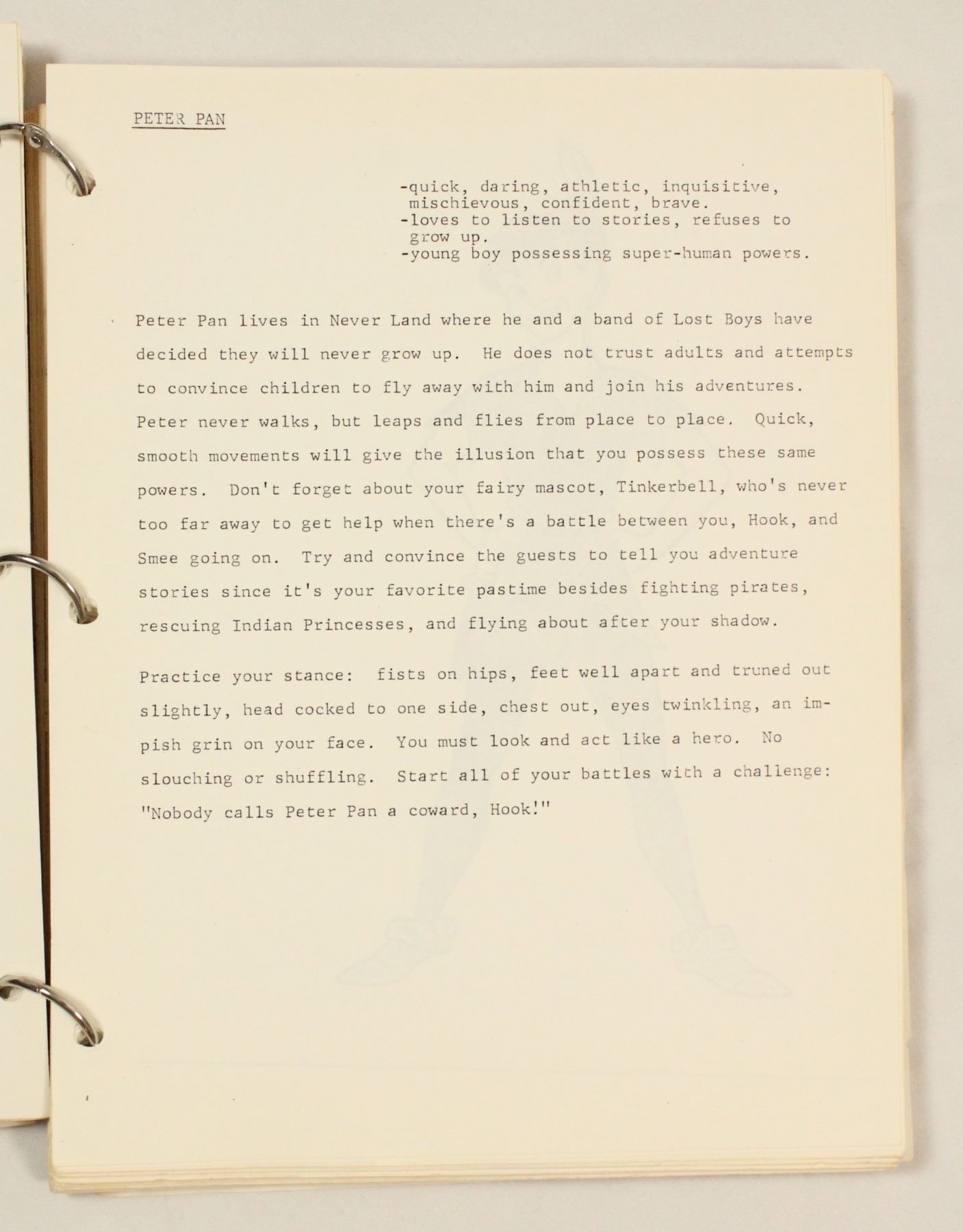 This is a company photocopied guide for cast members that portray characters in and around the Disney theme parks. It includes character biographies and directions on how the cast member should best act in order to accurately portray the assigned character. It is missing the cover and first page or two, but the information within is a historical testament to the Disney difference that brings such a magical experience to visiting the theme parks, resorts and restaurants where these characters can be found. It contains over 170 pages of character images, descriptions and cast member instructions on character performance. Only a few pages have edge tears or have their hole punches torn from use. Pages display edge wear from use. Measures 8.5" x 11" x .75".
