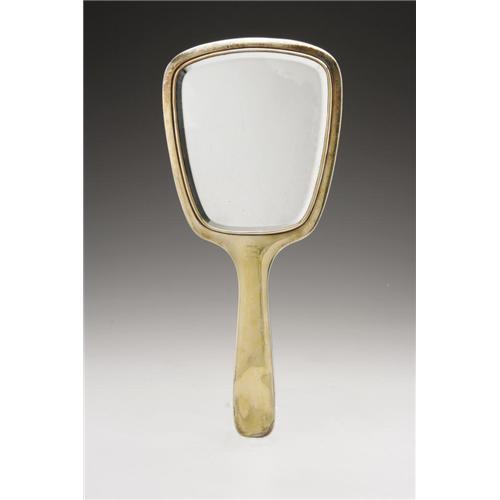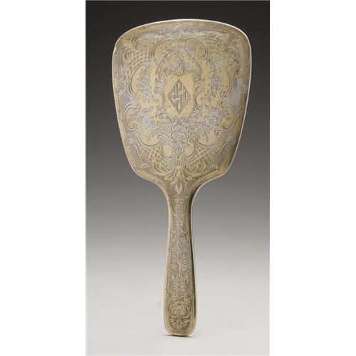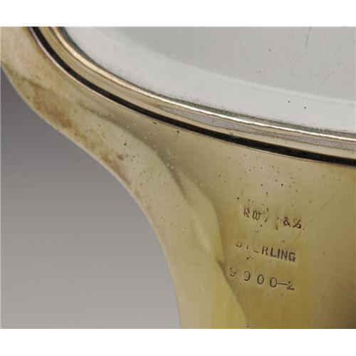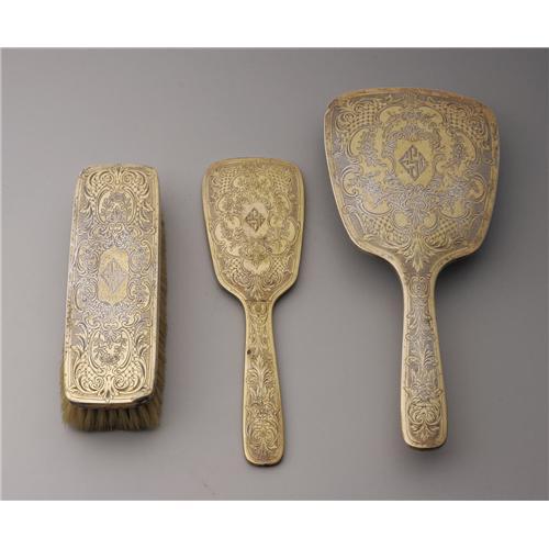<B>An American Silver Vanity Set</B></I><BR><B>Wallace & Sons Mfg. Co., Wallingford, CT, Late Nineteenth Century</B></I><BR><BR>Comprising two gilt hand mirrors and a clothes brush; monogram to the reverse <I>ESG,</B></I> hallmark with <I>STERLING 9900-2</B></I><BR>The larger mirror: 9.2in. long x 5in. wide3 Items <BR><BR><B>Condition Report:</B> Normal signs of wear as appropriate with age; gilding is worn; small mirror is missing glass; dent to one end of the brush.