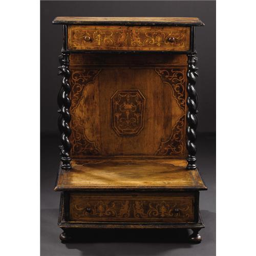 <B>A Walnut Italian Prie Dieu</B></I><BR><BR>Unknown maker, Italian<BR>Late Eighteenth/Early Nineteenth Century<BR>Various woods<BR>Unmarked<BR>37 inches high x 27 inches wide x 20 inches deep<BR><BR>With inlaid figures and supported by rope turned column with one drawer above and one below.<BR><BR><BR><BR><b>Shipping:</b> Requires 3rd Party Shipping (<a target="_blank" href="http://www.heritageauctions.com/common/shipping.php">view shipping information</a>)