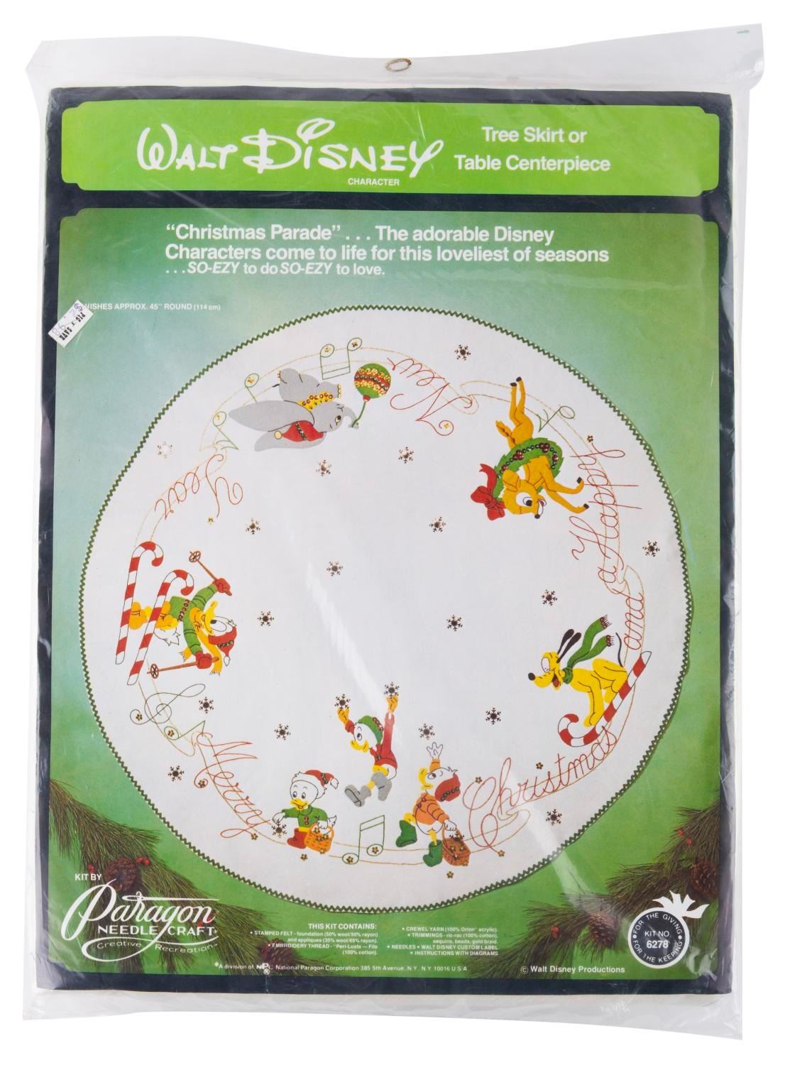 (Paragon, 1970s/80s) A needlecraft kit with everything needed to create a 45" round Disney character tree skirt or table centerpiece. The vintage kit is in fine, unopened condition.