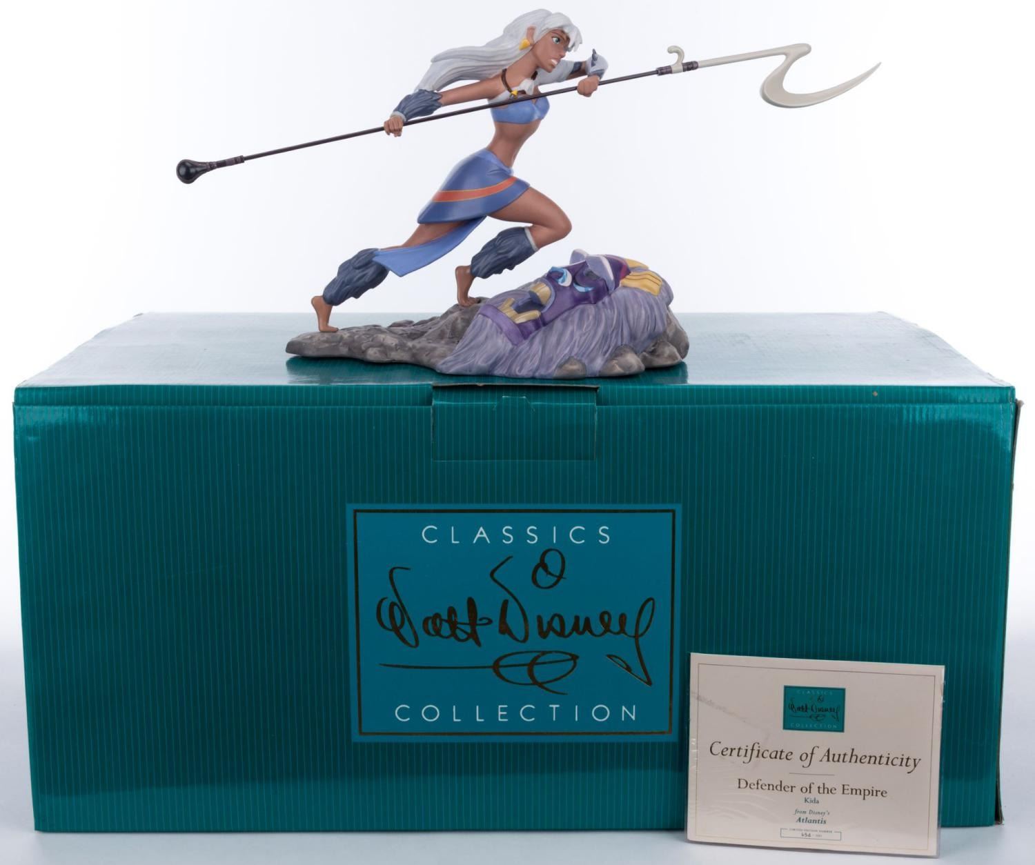 (WDCC, 2001) A Walt Disney Classics Collection figurine of Kida from Disney's "Atlantis: The Lost Empire." The ceramic figurine titled 'Defender of the Empire' was sculpted by Kent Melton and released in a limited edition of 2001. Measuring 16" x 6.5" and 8" tall, the figurine is in fine condition and comes with the original 21.5" x 14" x 10" box and COA.