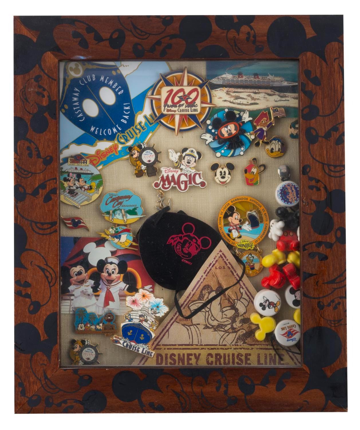 (Disney, 2000s) A fan-made Disney Cruise shadow box, featuring 16 mostly Disney Cruise exclusive pins, beads, a Mickey Pirate eye patch, and several clipped images. Measuring 10” x 12” x 2”, the shadow box displays in very good condition.