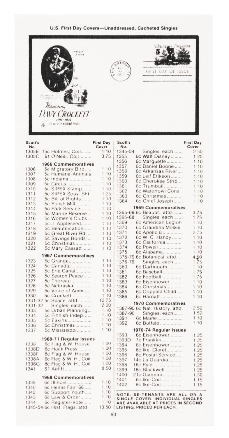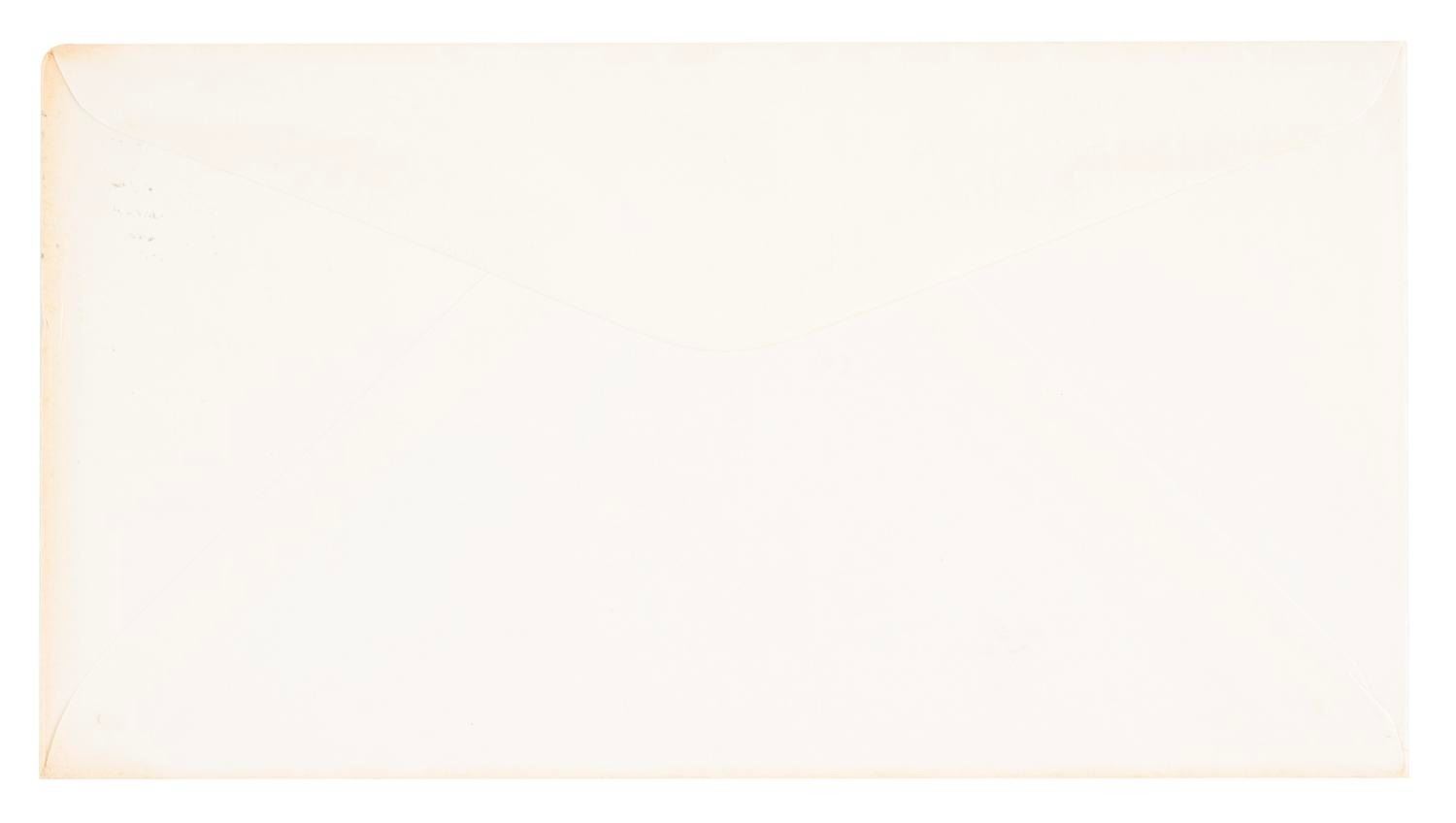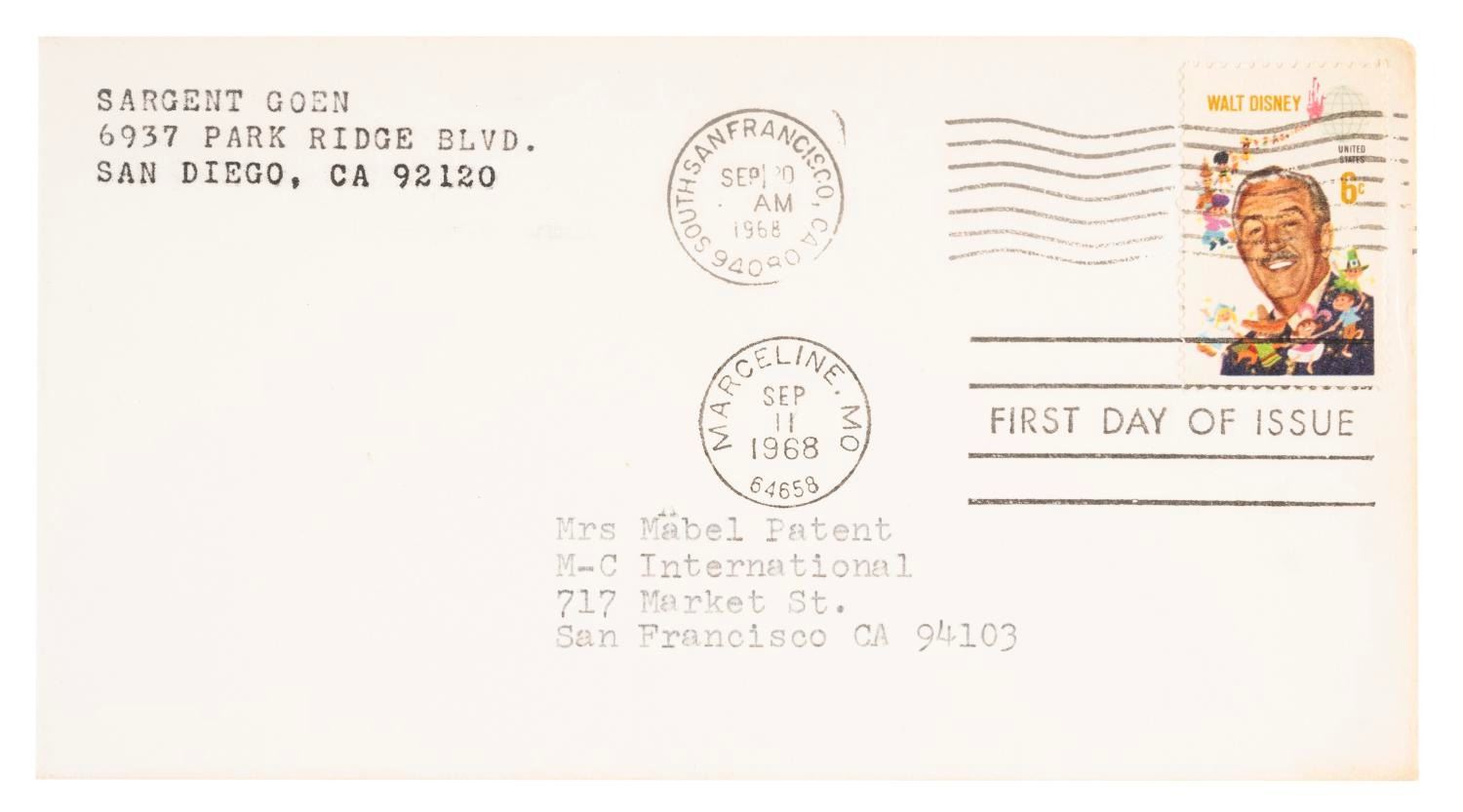 (Disney, 1968) An official first-day cover envelope from the release of Walt Disney’s 6-cent stamp from the United States Postal Service. The envelope has a Marceline Missouri (Walt Disney’s hometown) postmark dated September 11, 1968, and a later cancellation in San Francisco. Measuring 6.5” x 3.5”, the envelope is in very good, used condition.