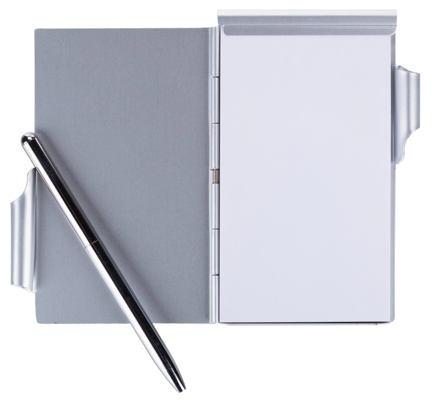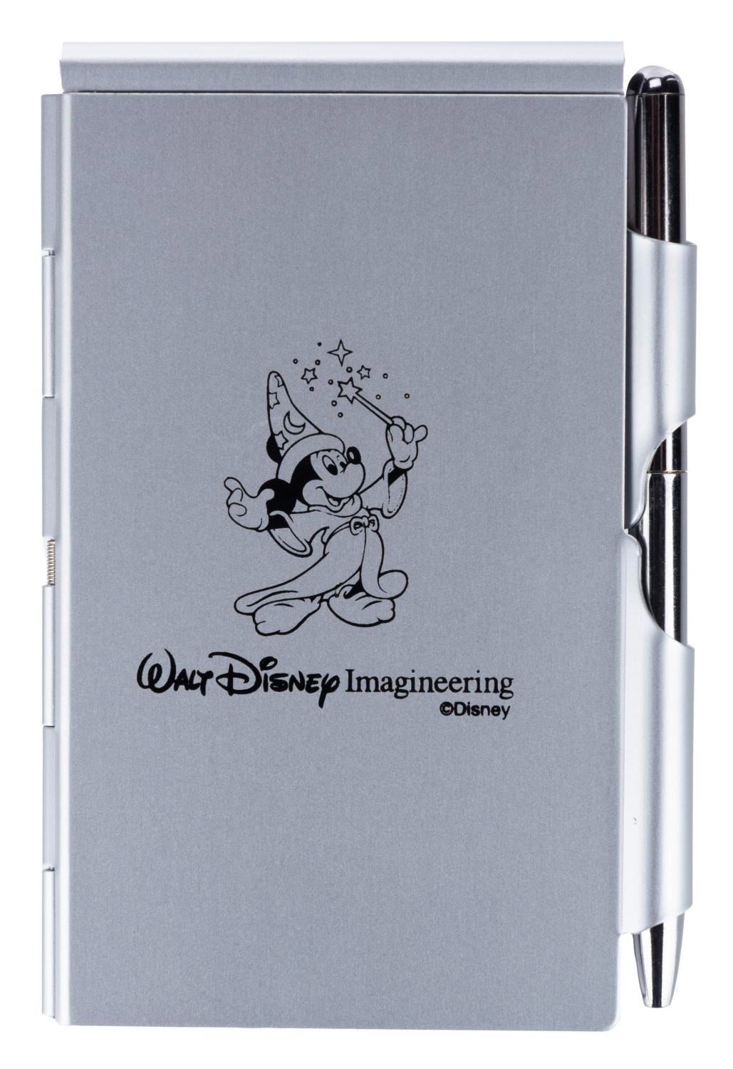 (Walt Disney Imagineering, 1990s) A chrome metal Imagineering notepad case, with a mini pad and pen. Measuring 4.5" x 3", the case and pad are in fine condition, with the 4.25" pen in fine condition requiring a fresh ink cartridge to function.