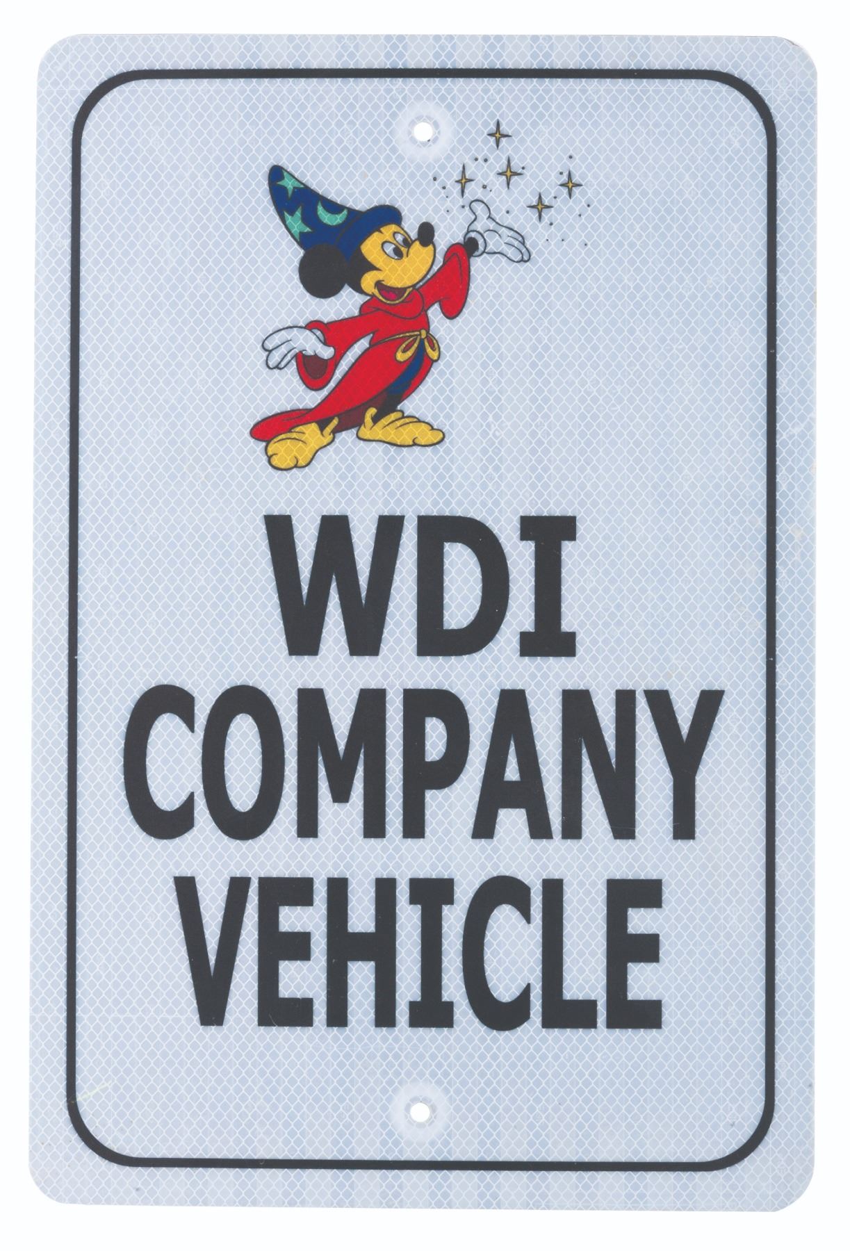 (Disneyland, 2000s) A metal Walt Disney Imagineering company vehicle parking sign featuring the Sorcerer Mickey logo and a reflective background for visibility. Measuring 12” x 18", the sign is in good condition overall, with light scratches and edge wear.