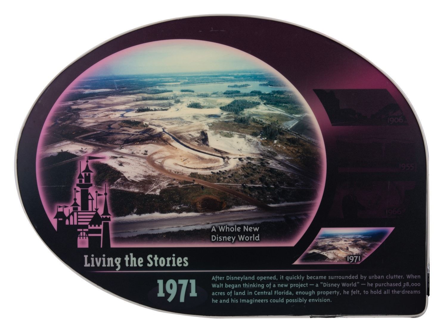 (Disney-MGM, 2001-2019) A plaque sign from "Walt Disney: One Man's Dream" at Disney's Hollywood Studios. The "Living the Stories" piece highlights the land that would be developed into Walt Disney's most momentous project in Central Florida - "Disney World." Measuring 22"x30" and .75" wide, the acrylic sign displays in good condition, exhibiting few cracks, slight scuffs, and minor wear from Park use.