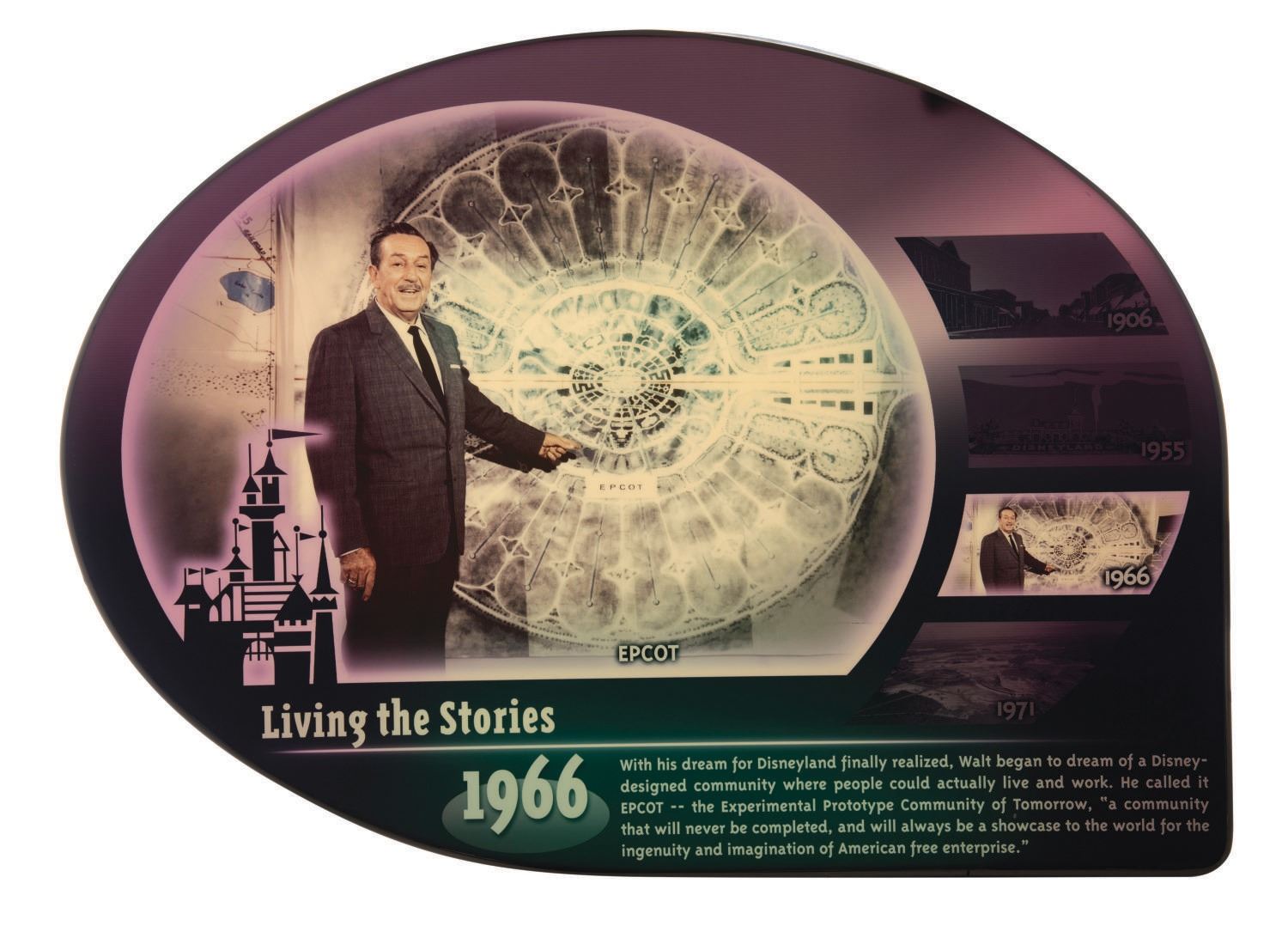 (Disney-MGM, 2001-2019) A plaque sign from "Walt Disney: One Man's Dream" at Disney's Hollywood Studios. The "Living the Stories" piece highlights Walt and his dream - "the Experimental Prototype Community of Tomorrow." Measuring 22"x30" and .75" wide, the acrylic sign displays in good condition, exhibiting few cracks, slight scuffs, and minor wear from Park use.