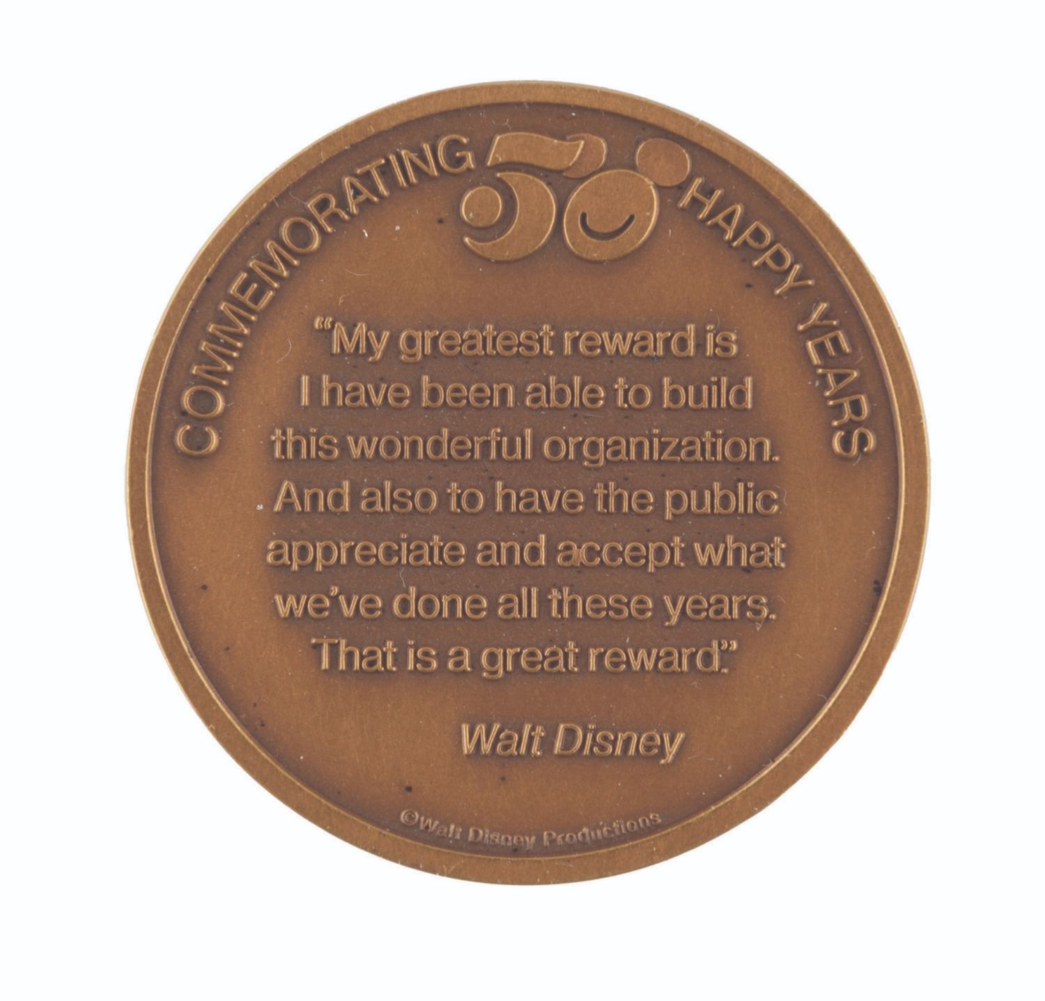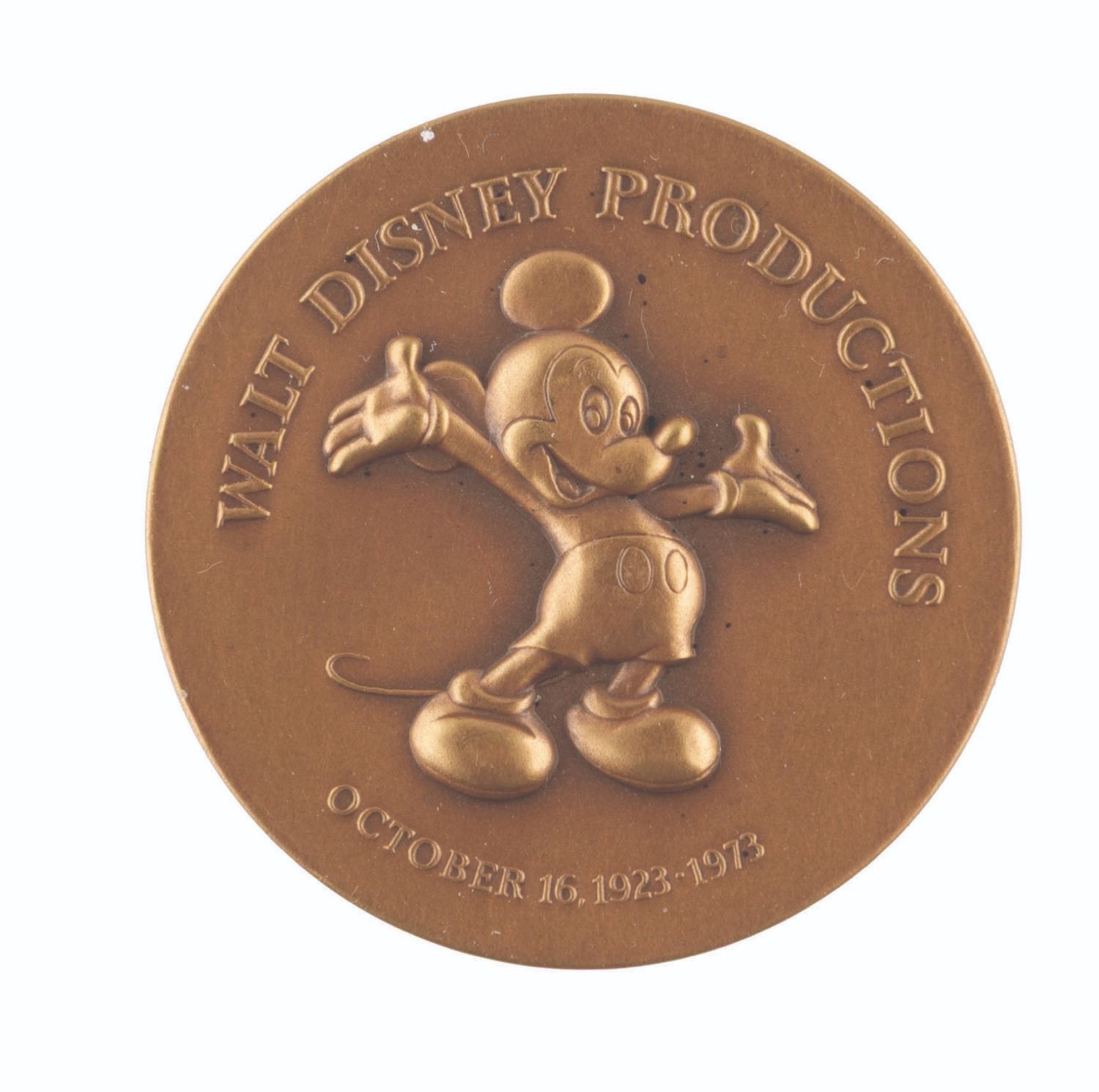 (Disney, 1973) A coin commemorating Walt Disney Productions’ 50th anniversary featuring Mickey Mouse on the front and a quote from Walt and "Commemorating 50 Happy Years" on the reverse. Measuring 1.5" in diameter, the medallion is in fine condition with very light handling wear.