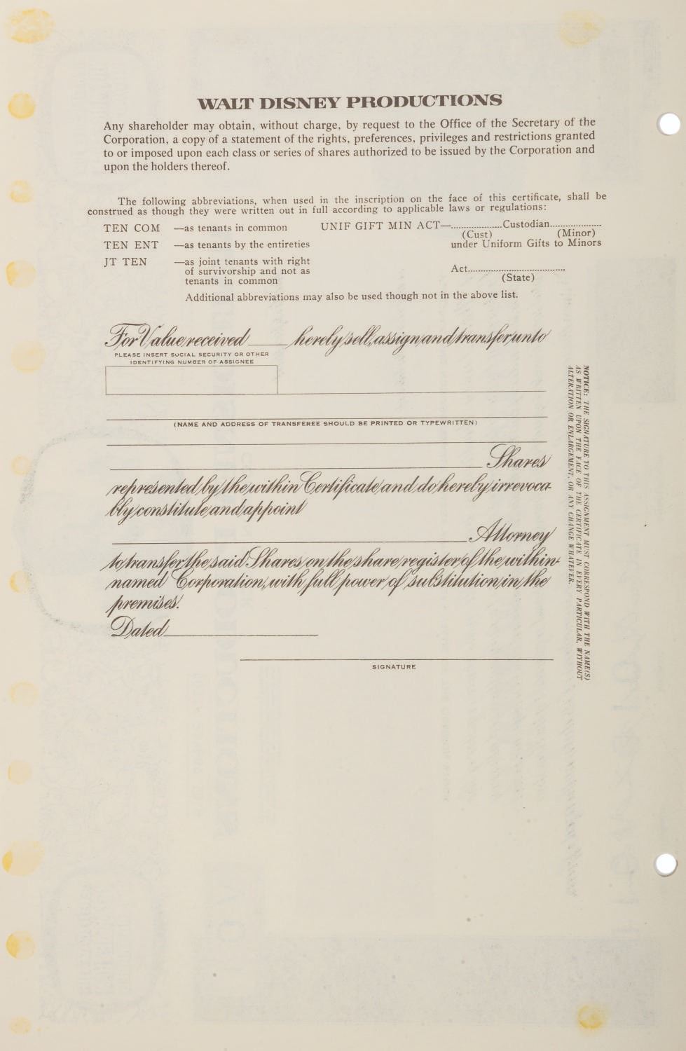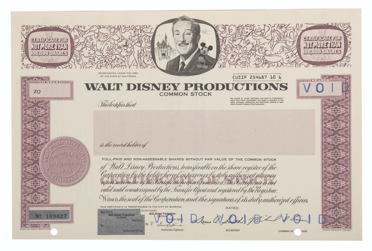 (Disney, 1967) A Walt Disney Productions stock certificate, illustrated with a portrait of Walt Disney and characters. Measuring 8"x12.25" this document is stamped "void" on its surface and is in fine condition.