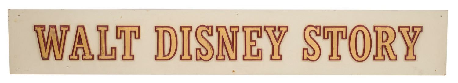 (Walt Disney World, 1970's-1980's) A large wooden sign for the Walt Disney Story attraction on Main Street in Walt Disney World's Magic Kingdom. In a film narrated by Walt Disney himself, the life story of the Company's founder is told. Measuring 73"x10.5", the sign is in very good condition, with wear typical of park use including scuffs, and light wear to corners.
