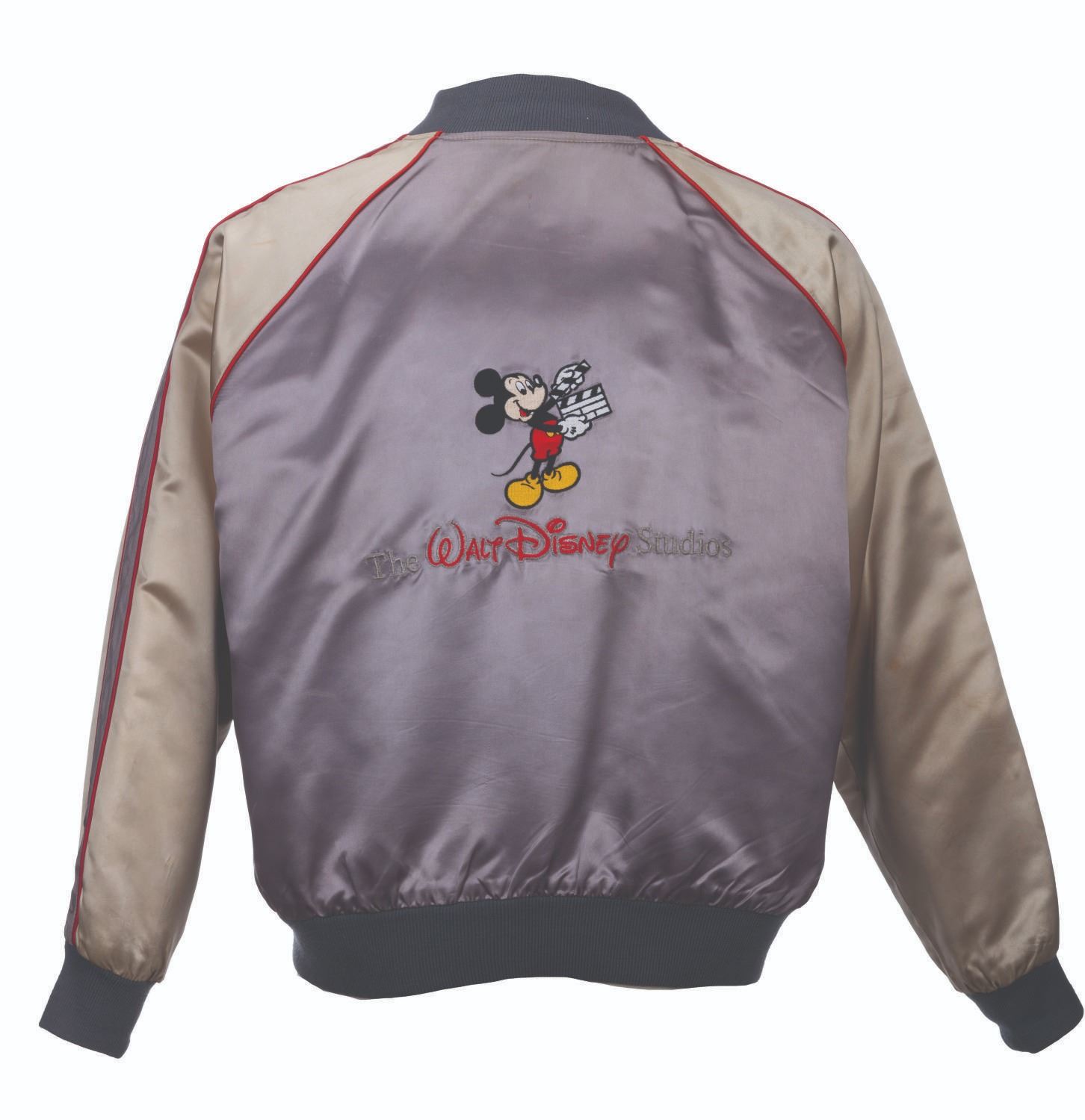 (Disney, 1980s-1990s) A Walt Disney Studios employee jacket, silver on the outside and featuring a dazzling red lining inside. The back displays Mickey holding a clapperboard. A size XL, the jacket is in good condition with wear and scratches throughout the exterior.