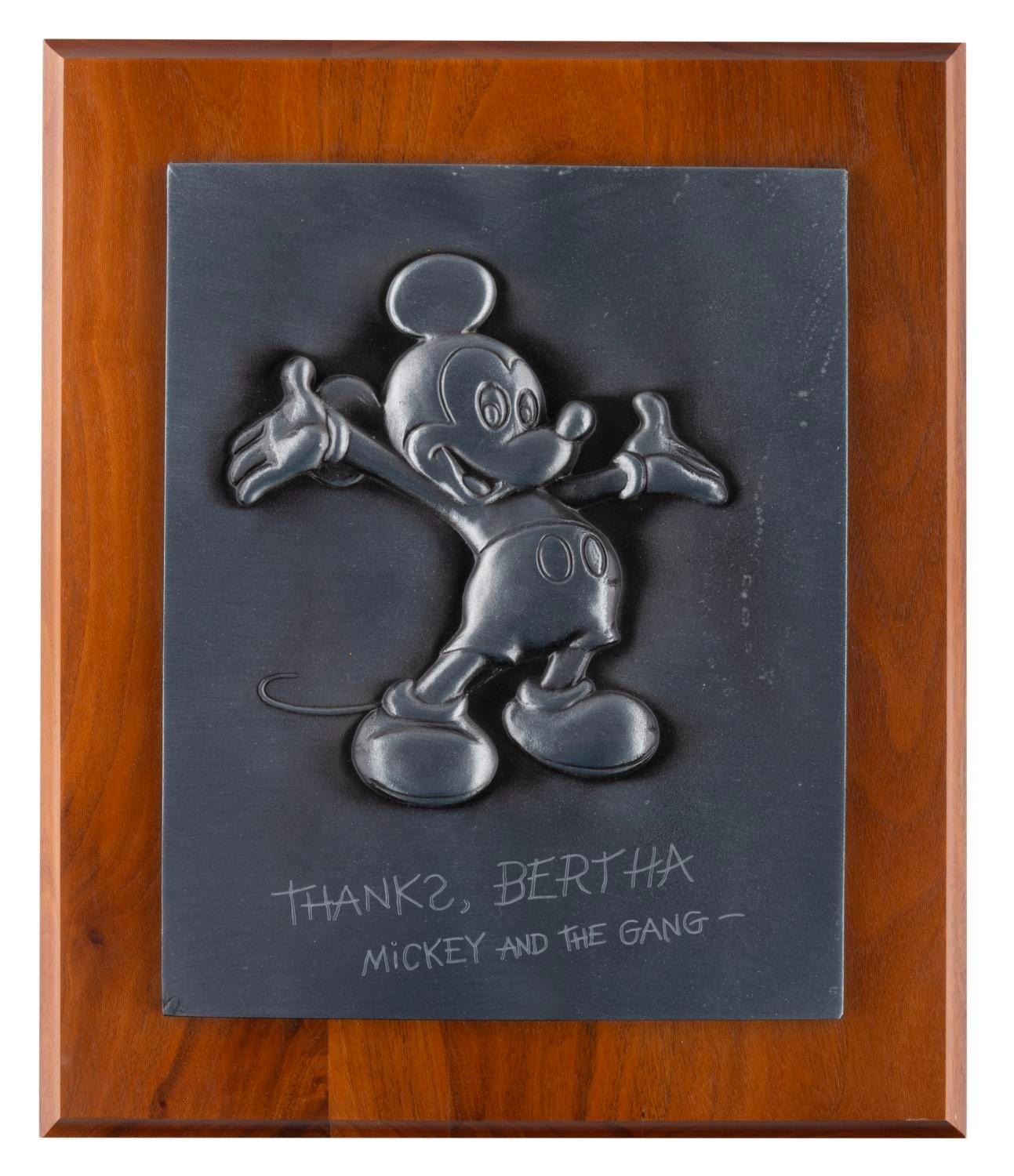 (Walt Disney Studios, 1980s) A wood and pewter plaque featuring Mickey Mouse presented to a Walt Disney Studios employee upon her retirement. The plaque reads, "Thanks, Bertha" and is signed "Mickey and the Gang." The plaque measures 13" x 11" and is in very good condition with some minimal scuffing and wear from age.