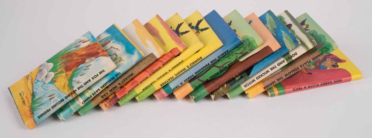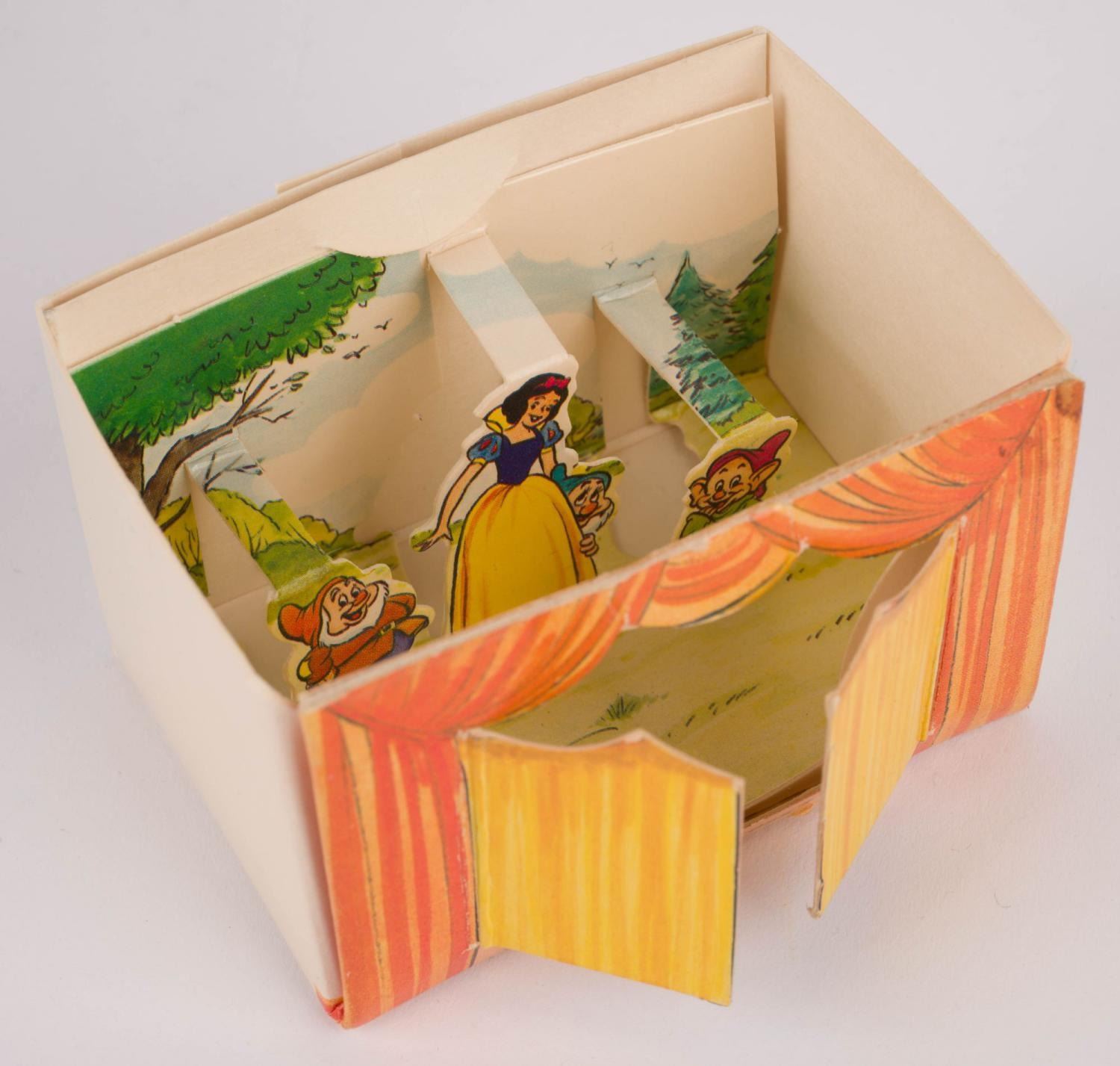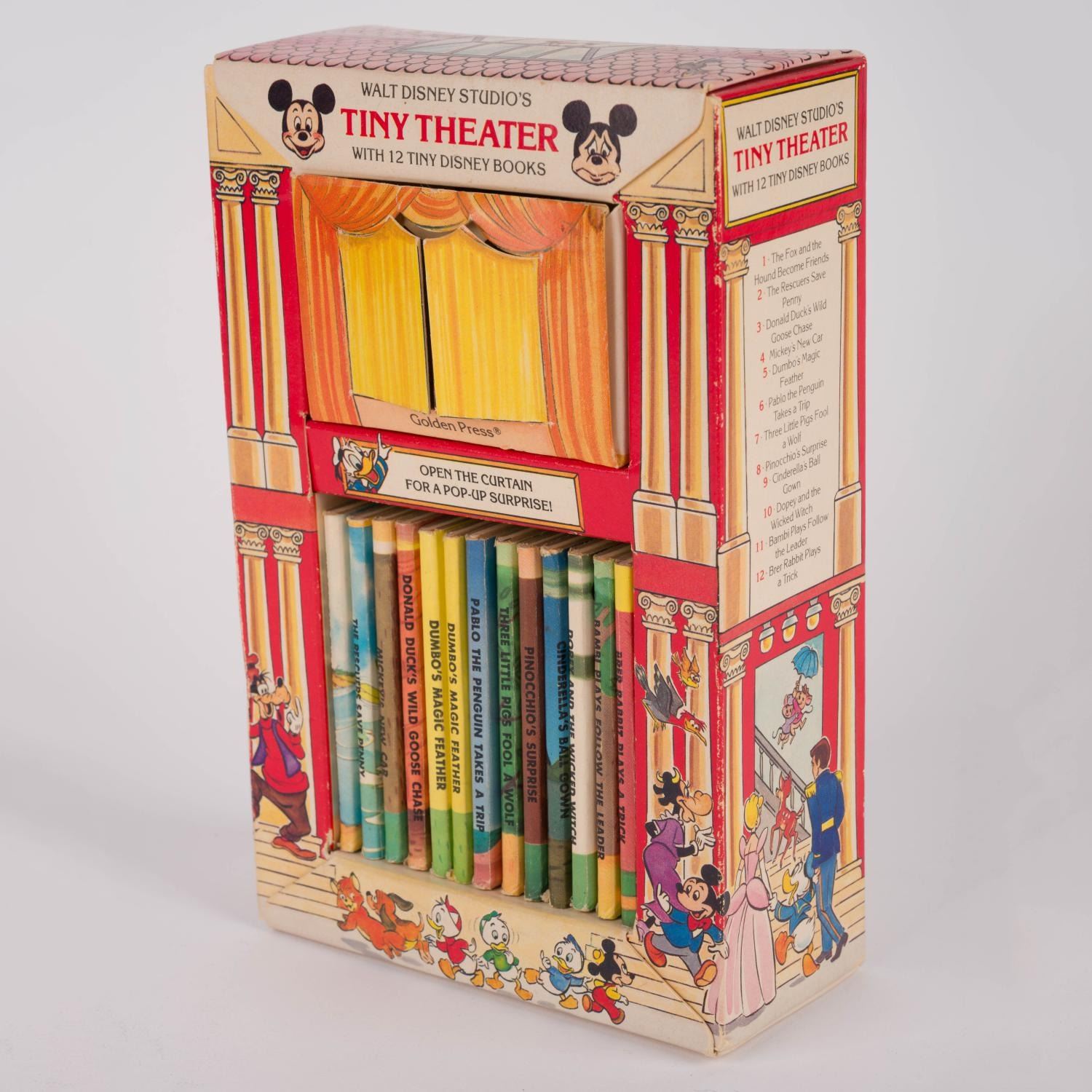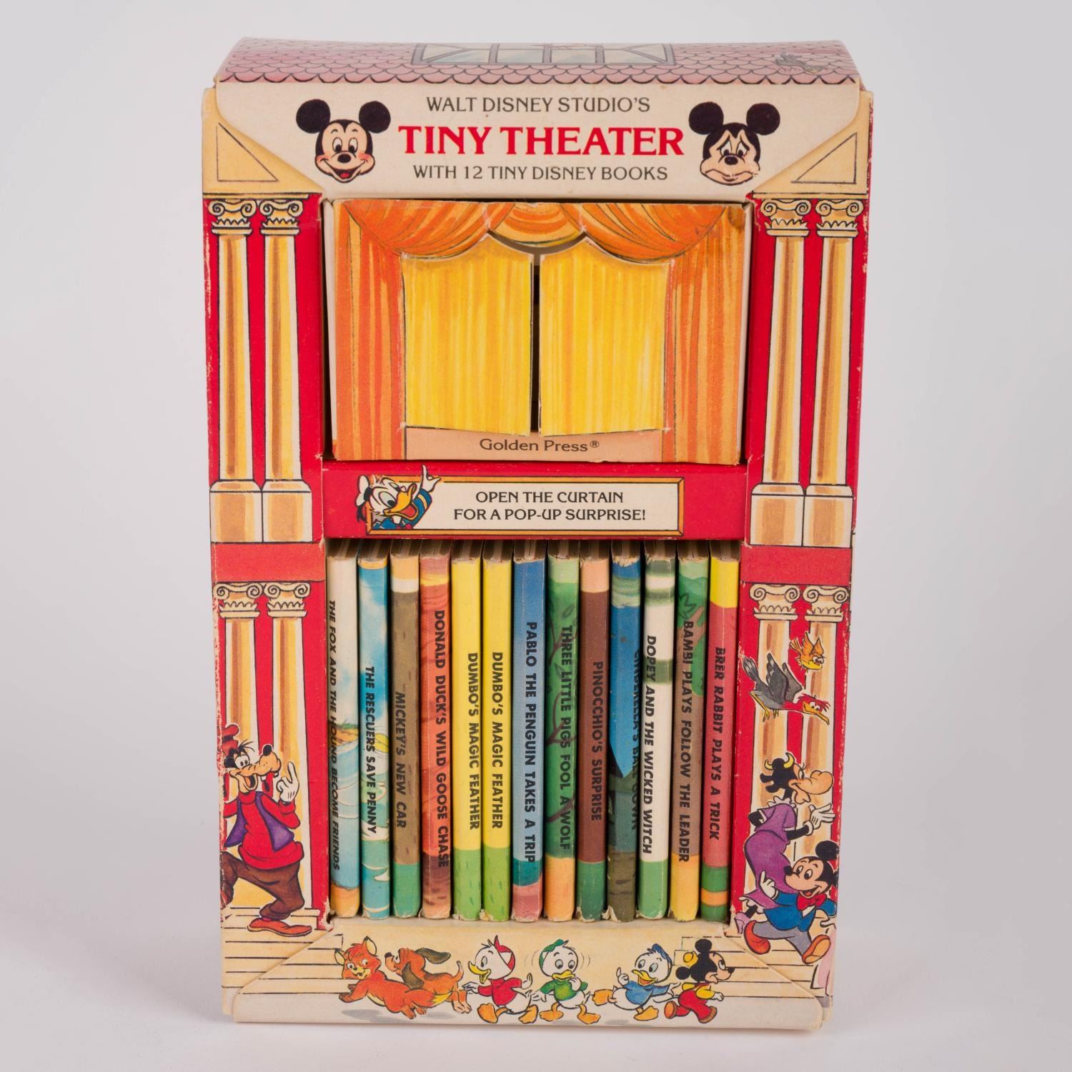 (Golden Press, 1981) A set of 12 books inspired by the Disney Studios animated films and characters. The package mimics the entrance of a movie house, complete with a cardboard curtain that opens to reveal a "pop-up” Scene of Snow White. The set includes 13 miniscule storybooks, including "Mickey's New Car, "The Rescuers Save Penny," and two copies of "Dumbo’s Magic Feather,” one spare to the complete set. Measuring 5" x 2.5" x 8" tall, the set is in very good condition with typical light weear from handling and age. The books themselves show no signs on page or internal wear, but the spines have some tears and wear to the edges. The box is in good structural condition, with some pen marks and overall edge wear.