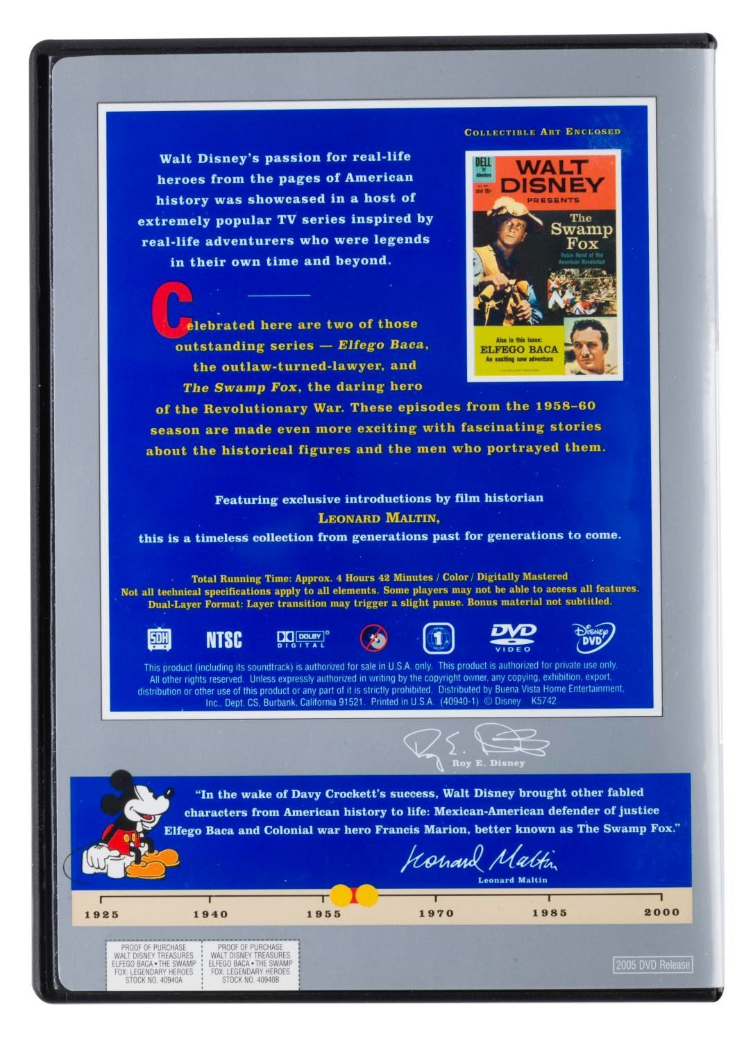 (Disney, 2008) A two-DVD set featuring "The Swamp Fox” and "Elfago Baca” from the 1958 through 1960 Disney anthology series. The set is in fine condition with very light handling wear mainly to the tin case.