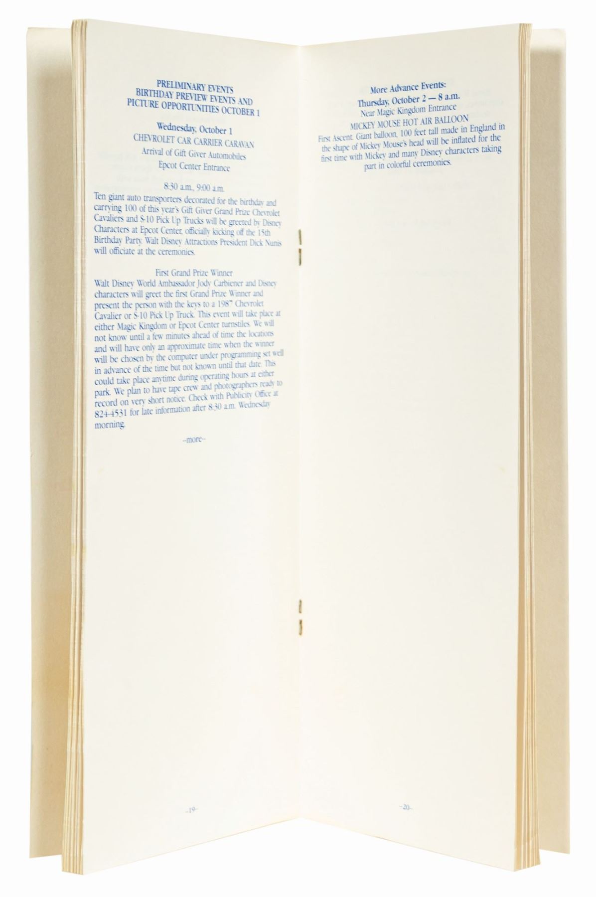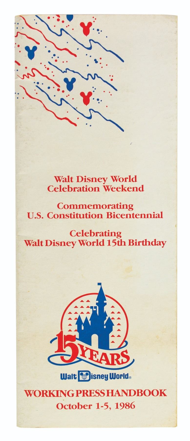 (Walt Disney World, 1986) A press handbook for the Walt Disney World Celebration Weekend commemorating the U.S. Constitution Bicentennial and the Park’s 15th anniversary, held October 1-5, 1986. The 39-page booklet provides a daily itinerary of events, travel details, contact lists, and a list of Disney executives and creative personnel available for interviews. Measuring 4.25” x 11, the handbook is in good condition with stains, wear from use, and discoloration from age. Est. Opening Bid: $10.00