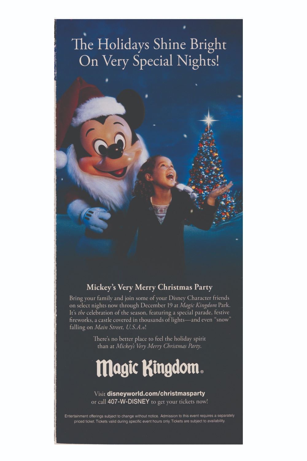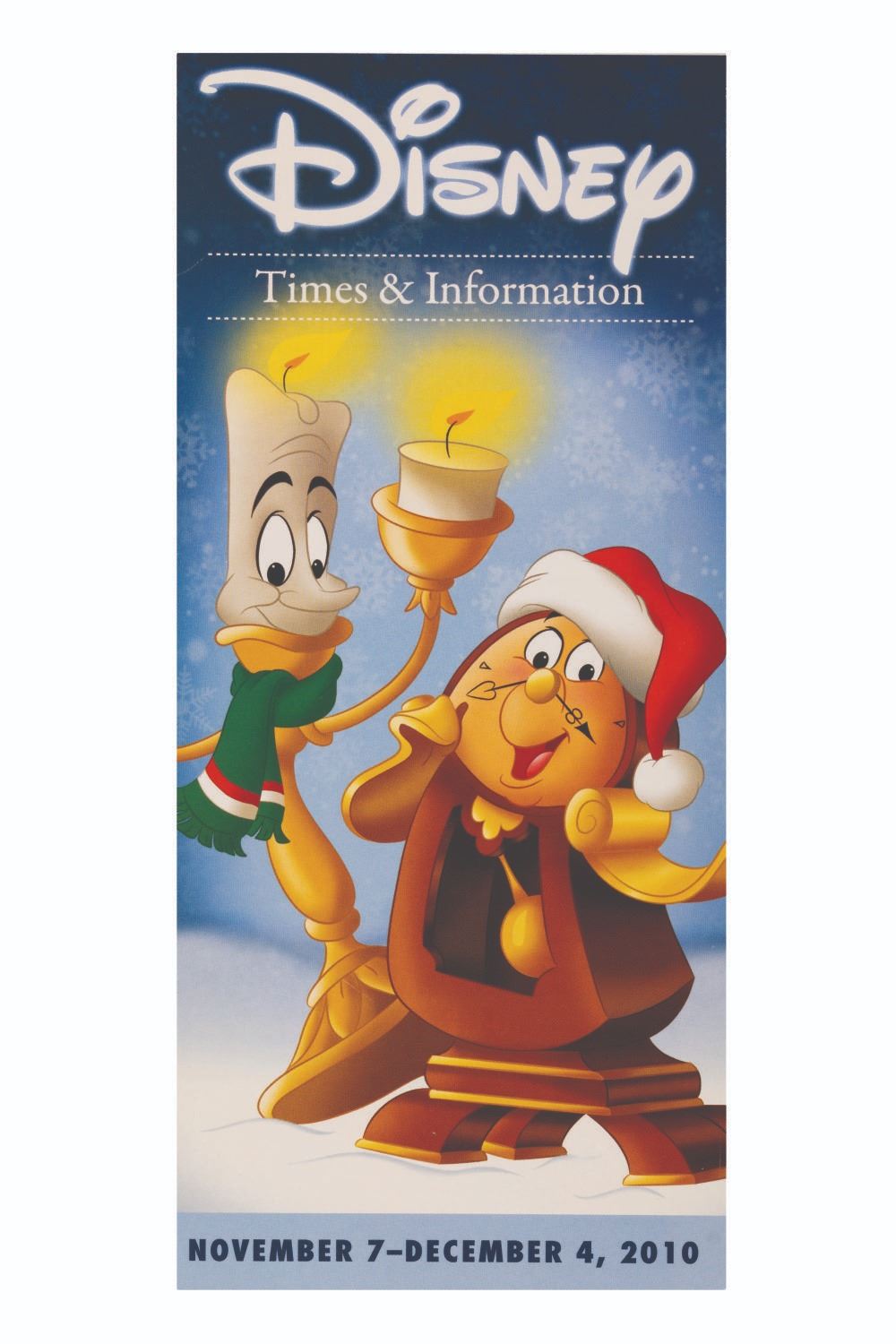 (Walt Disney World, 2010) A main gate Disney Times and Information brochure for holiday events happening around the Florida Parks from November 7 - December 4, 2010. Measuring 4” x 9”, the brochure is in very good condition with light creases and wear.