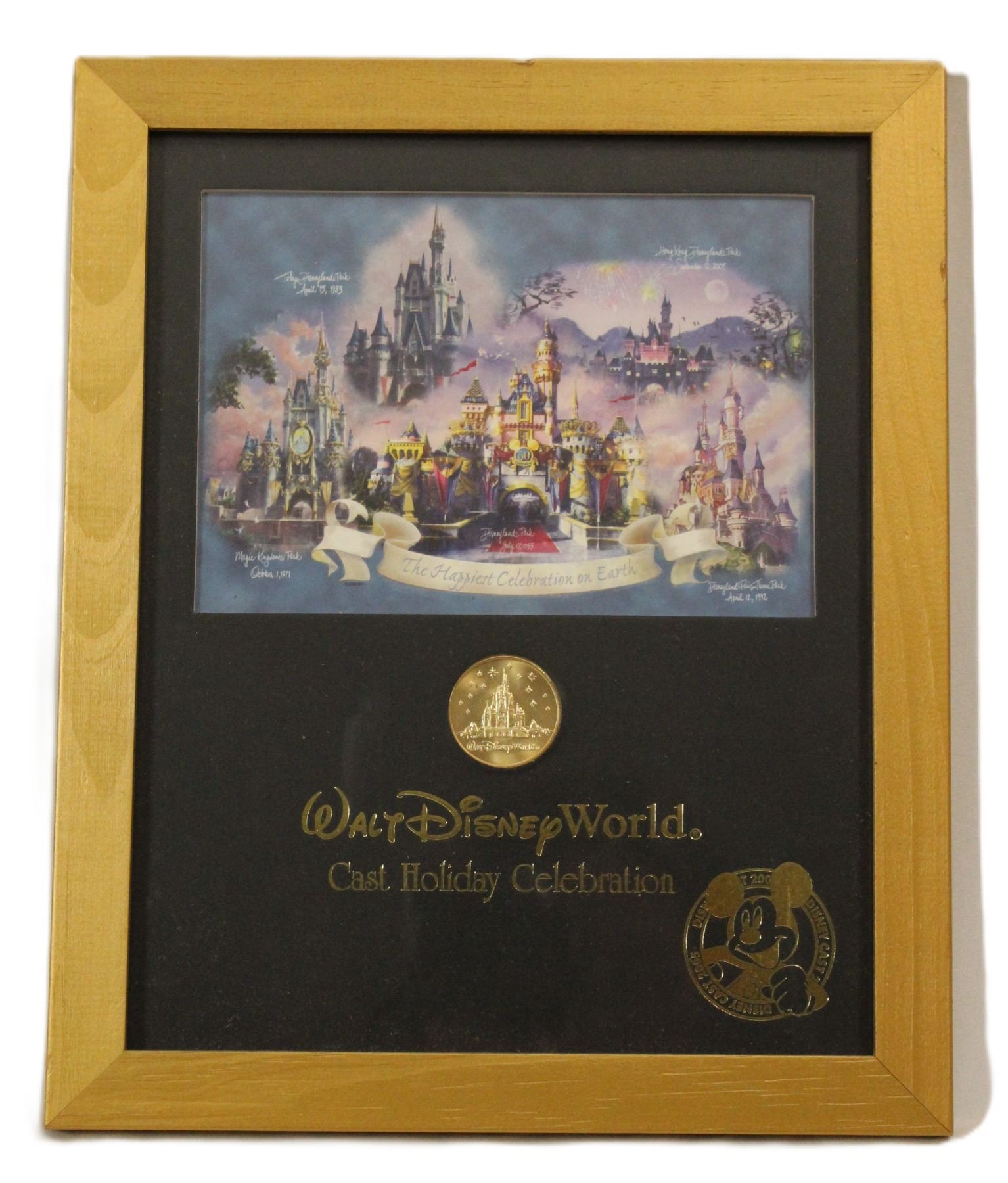 (Walt Disney World, 2005) A "Walt Disney World The Happiest Celebration on Earth" cast member print and gold coin set in a golden frame. Measuring 9.25" x 11", it is in very fine condition with no noticed flaws.