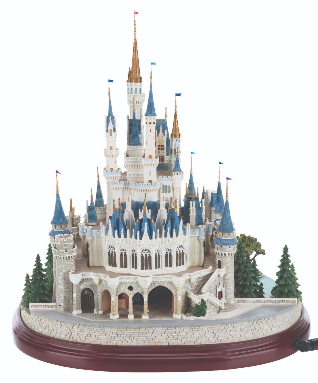 (Olszewski, 2005) An original scale model of Walt Disney World’s Cinderella Castle, signed by the designer Robert Olszewski. The model lights up with an AC adaptor (not included) and functioned when tested. The resin model with a wooden base measures 12” x 11” x 12.5” tall. The model displays in very good condition with a light crack along the second-floor balcony on the back of the castle, and light chips along the edges of the base on the reverse.