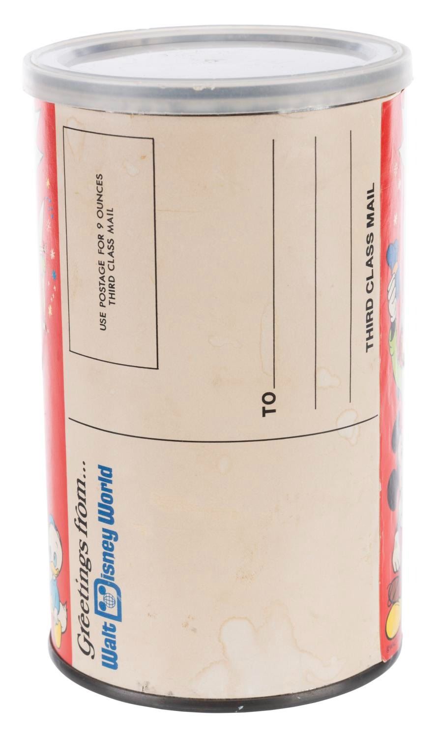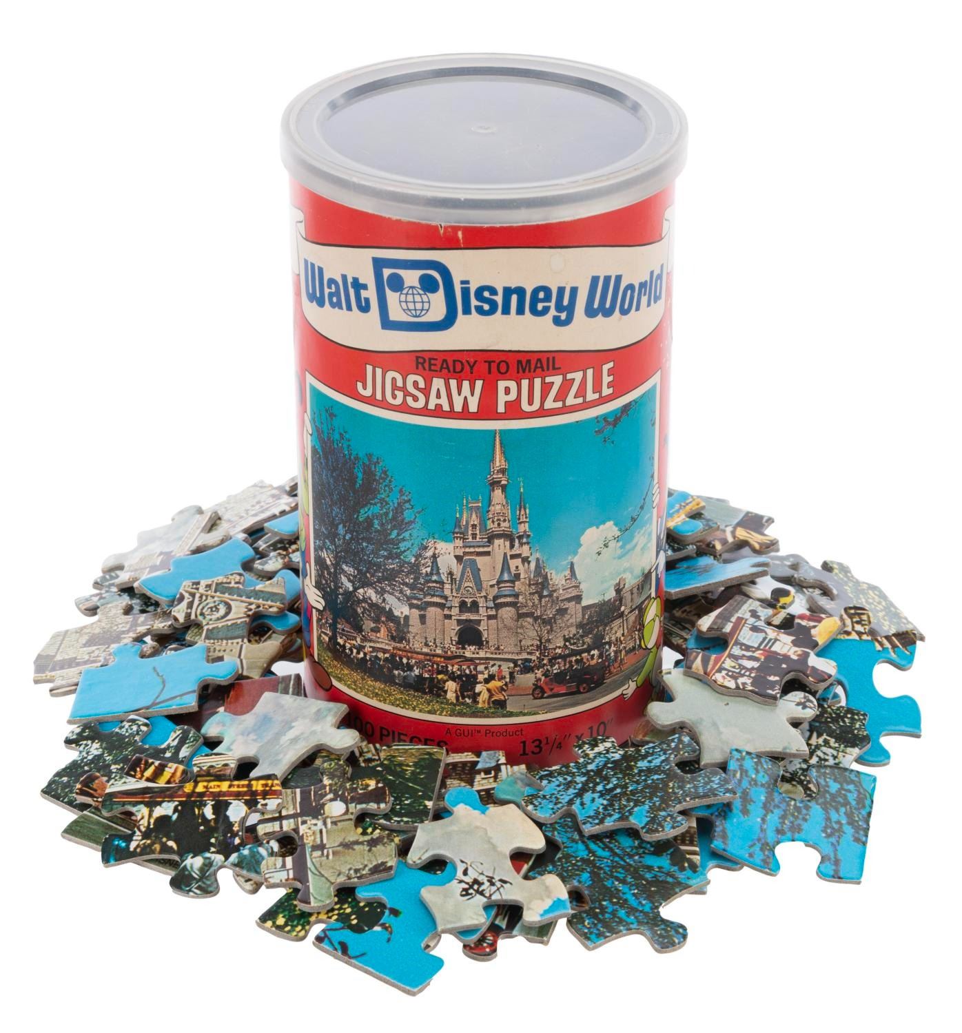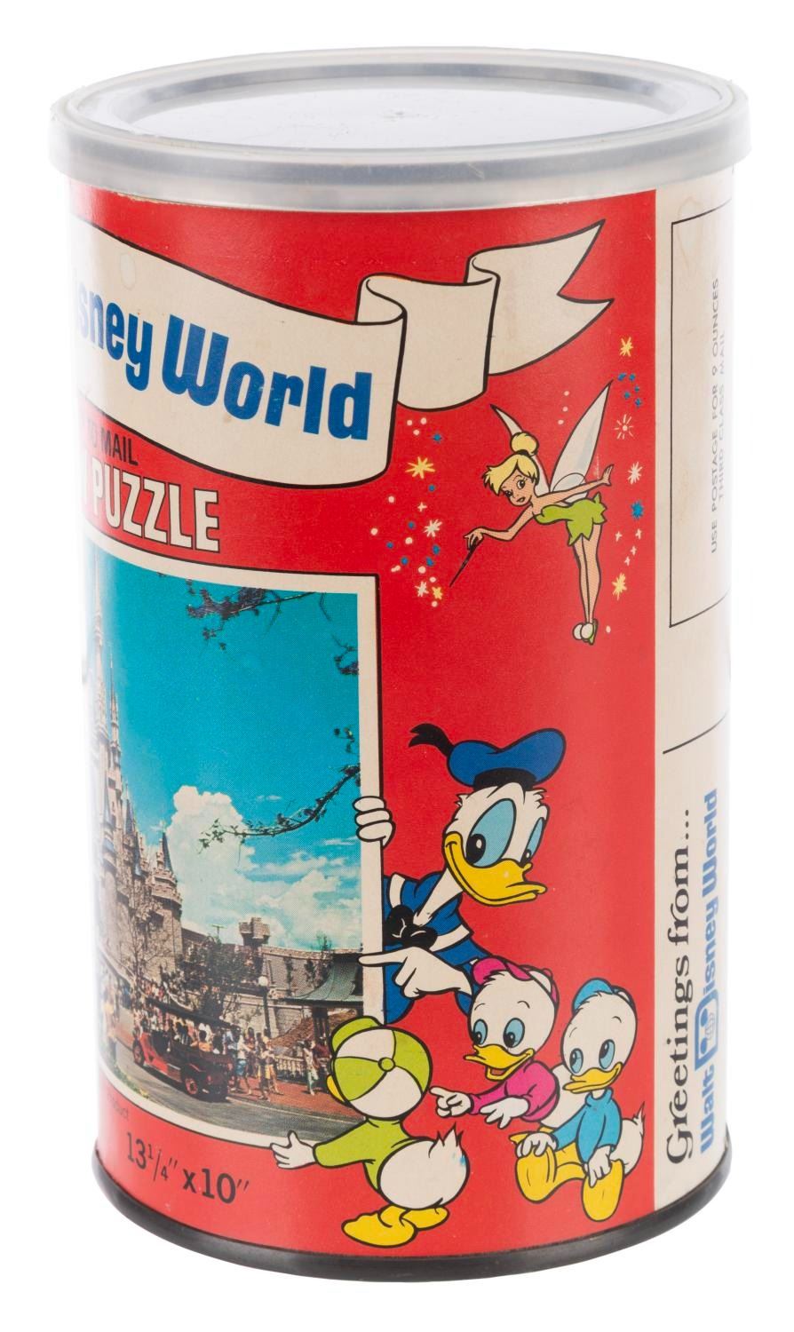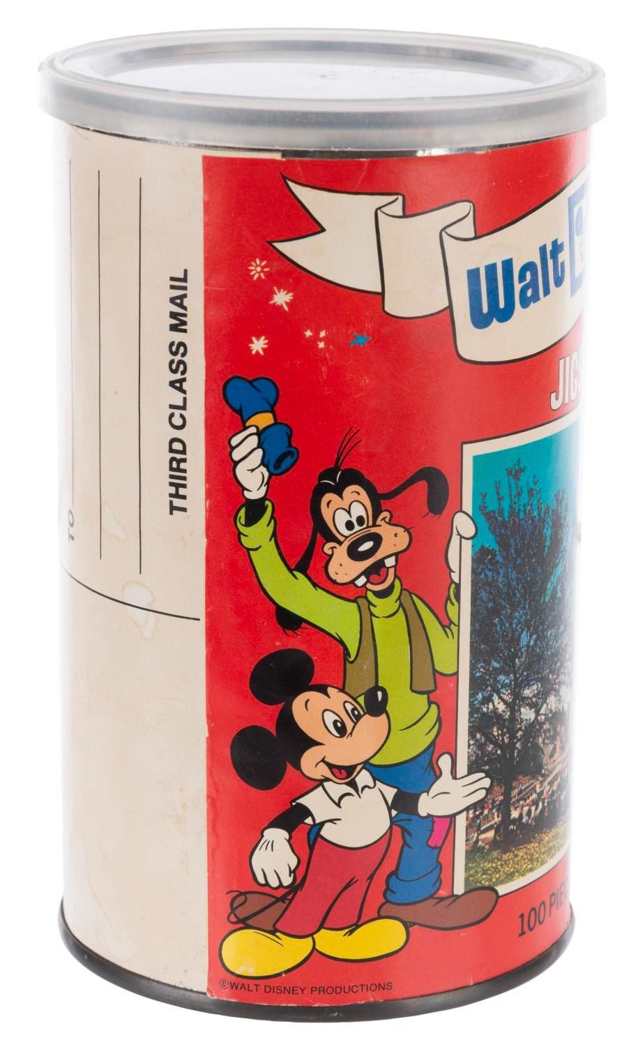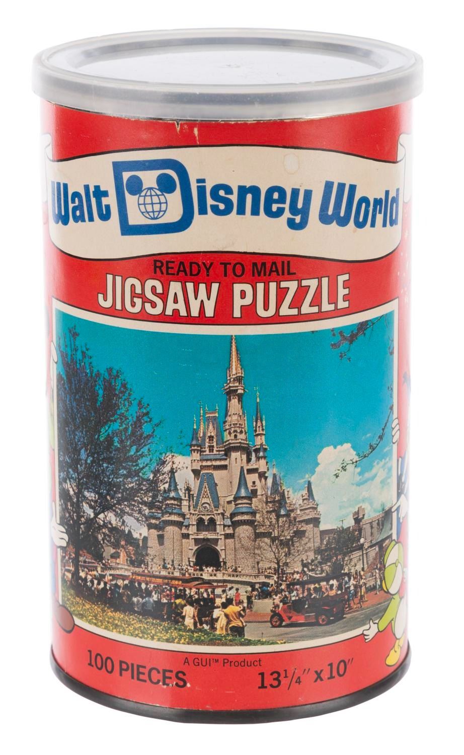 (Walt Disney World, 1970s) A souvenir 100-piece puzzle of Cinderella’s Castle, sold in a canister designed to be sent as is through the mail. The puzzle is in very good condition, with the 5.5" x 3.5" diameter cannister in good condition with wear from handling and age, including light water stains.