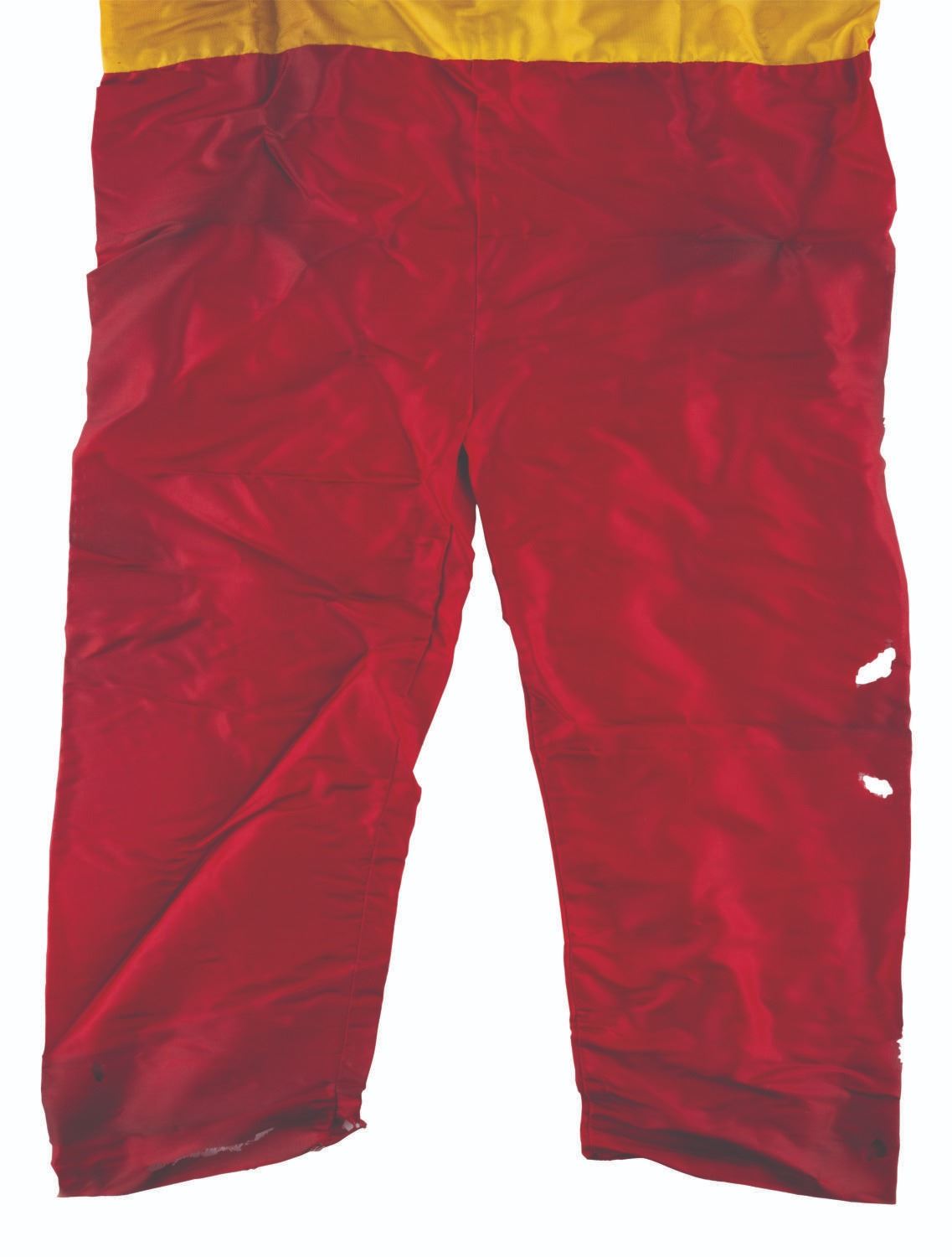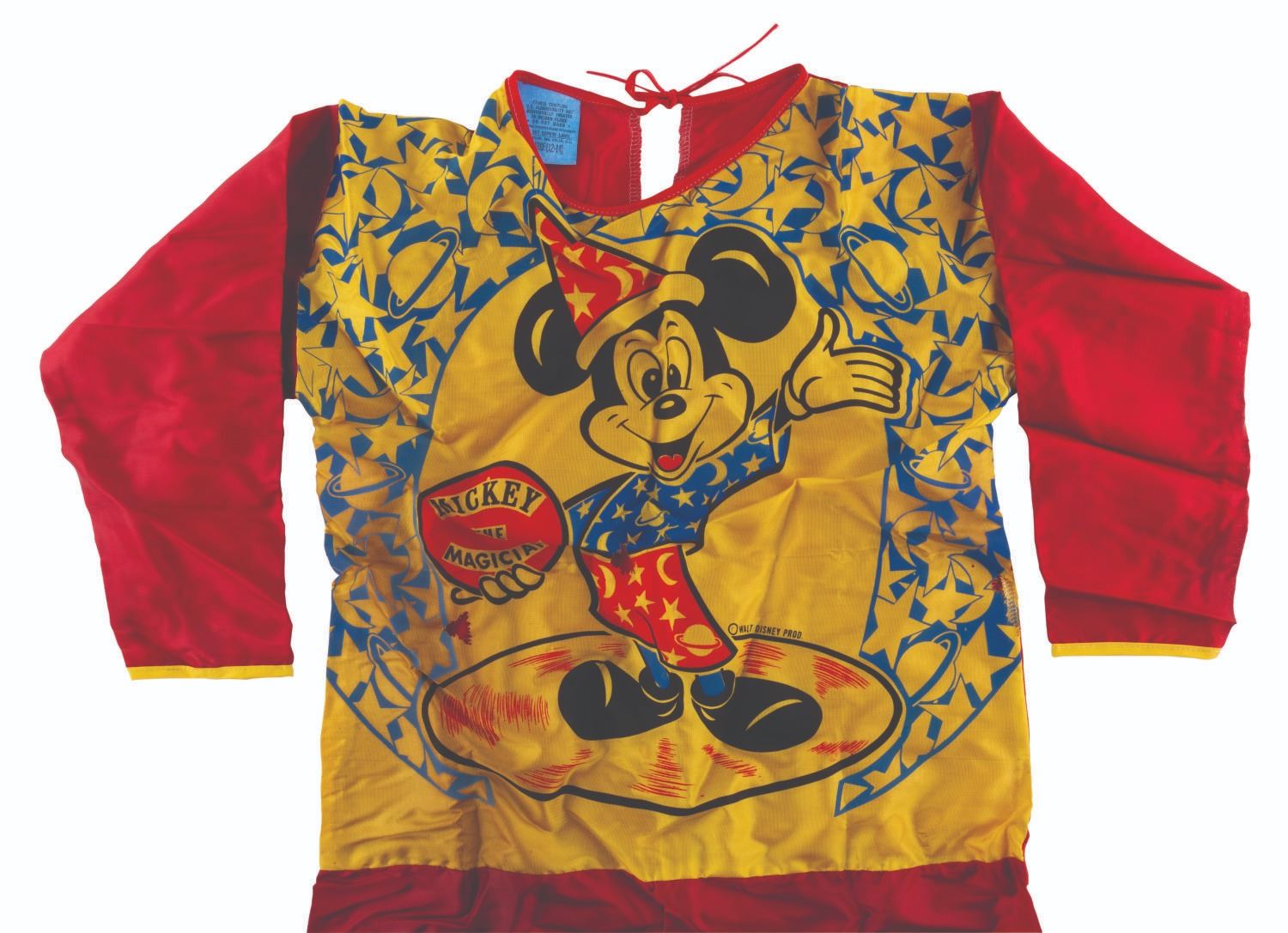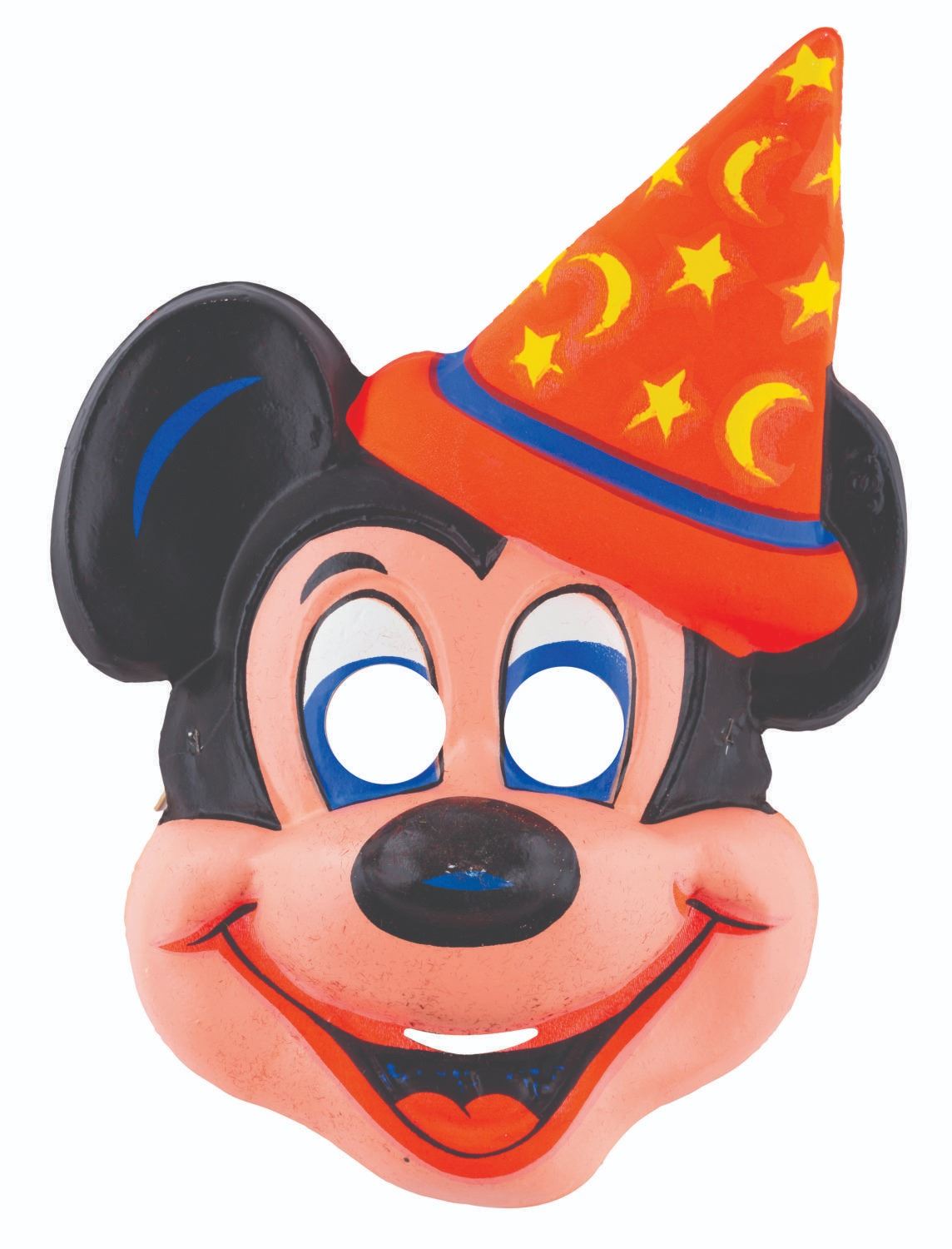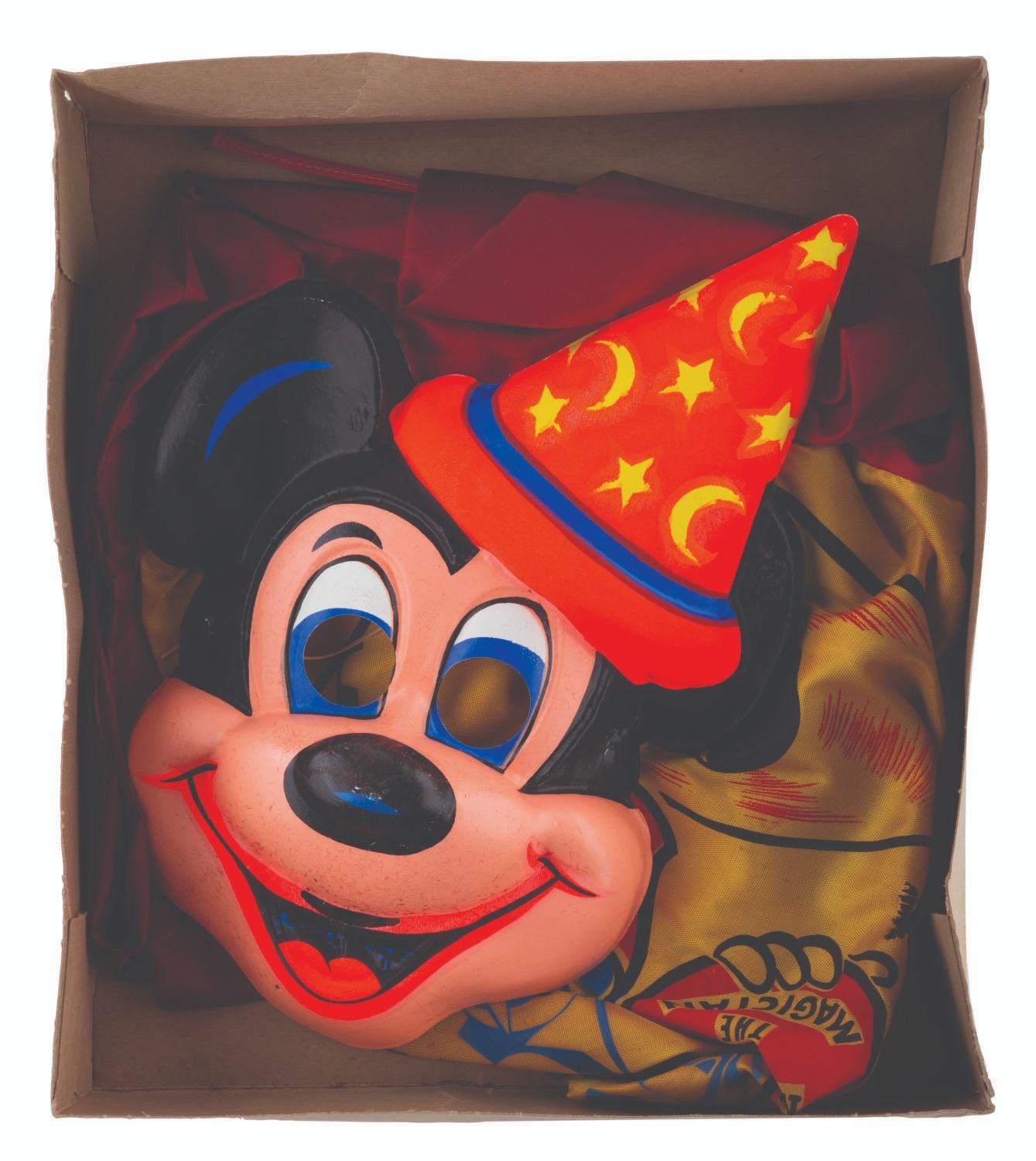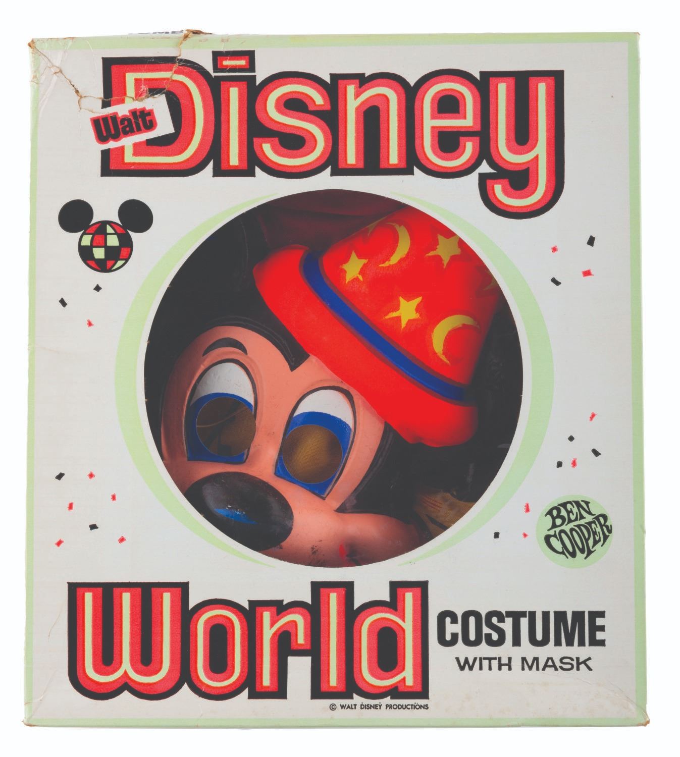 (Ben Cooper, 1970s) A Walt Disney World Mickey Mouse Halloween costume and mask with the original box. Measuring a size “Large 12-14”, the mask is in very good condition, while the costume is in fair condition with several 1” holes through the otherwise good fabric. The 12” x 11” x 2.75” box is in good condition with a 3.5” crease and tear at the top corner, and light wear overall.