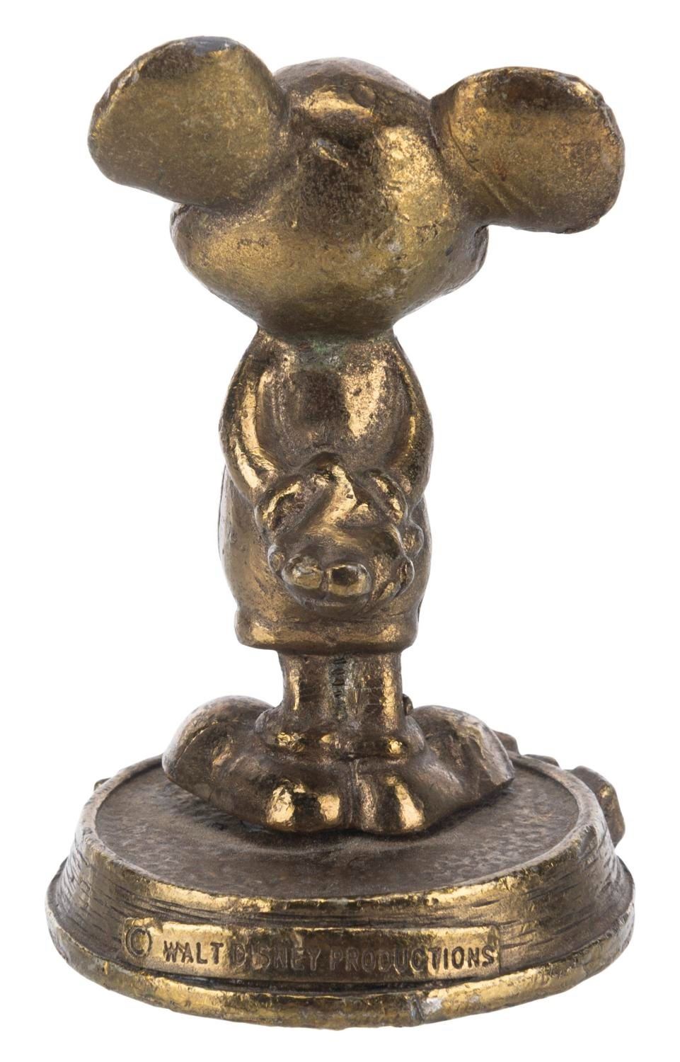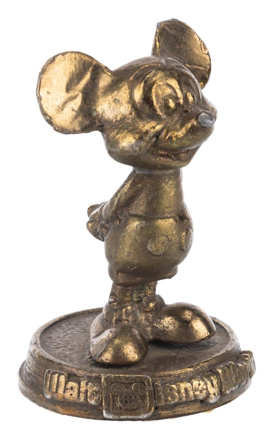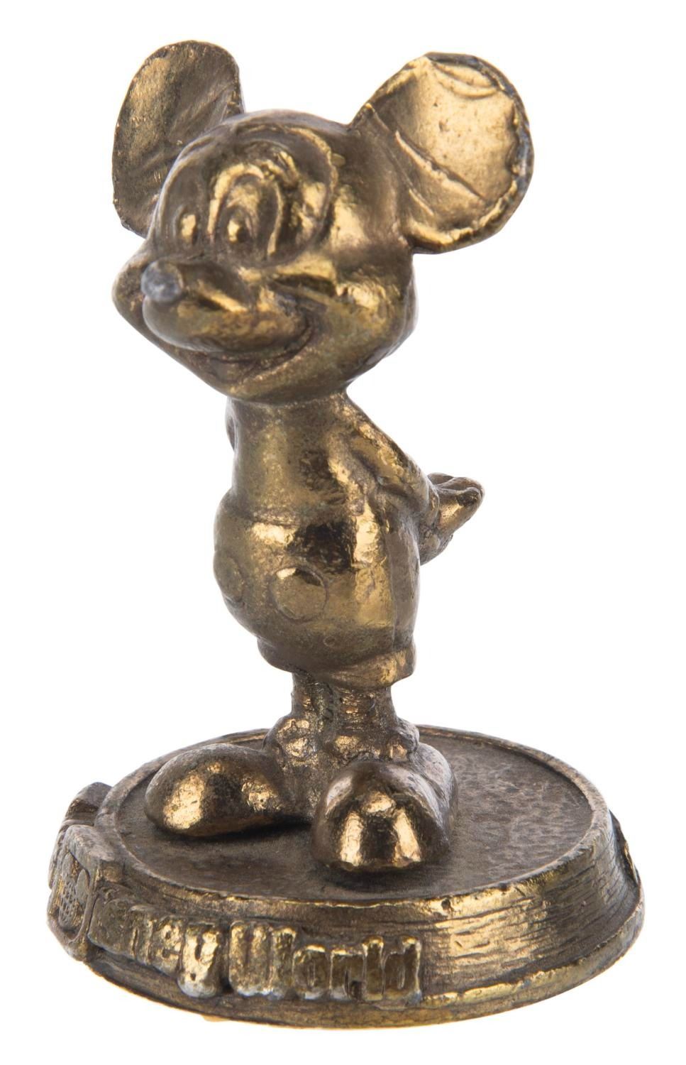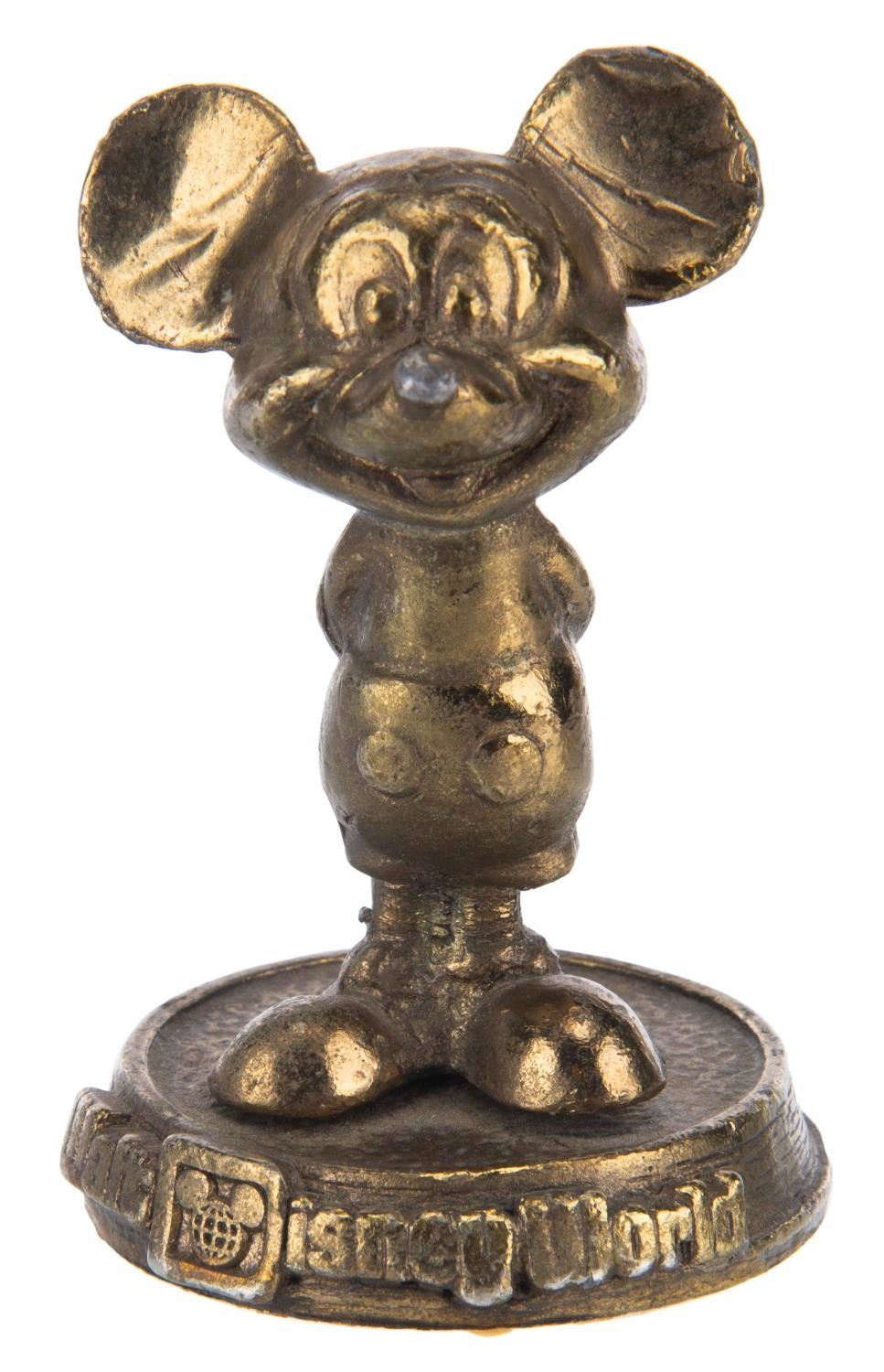 (Walt Disney World, 1970s) A figural Mickey Mouse paperweight souvenir of Walt Disney World. Measuring 2.75" tall and 1.75" in diameter, the paperweight displays in fair condition with scuffs, oxidation from age, wear, paper residue on the bottom, and wear, with Mickey slightly loose.