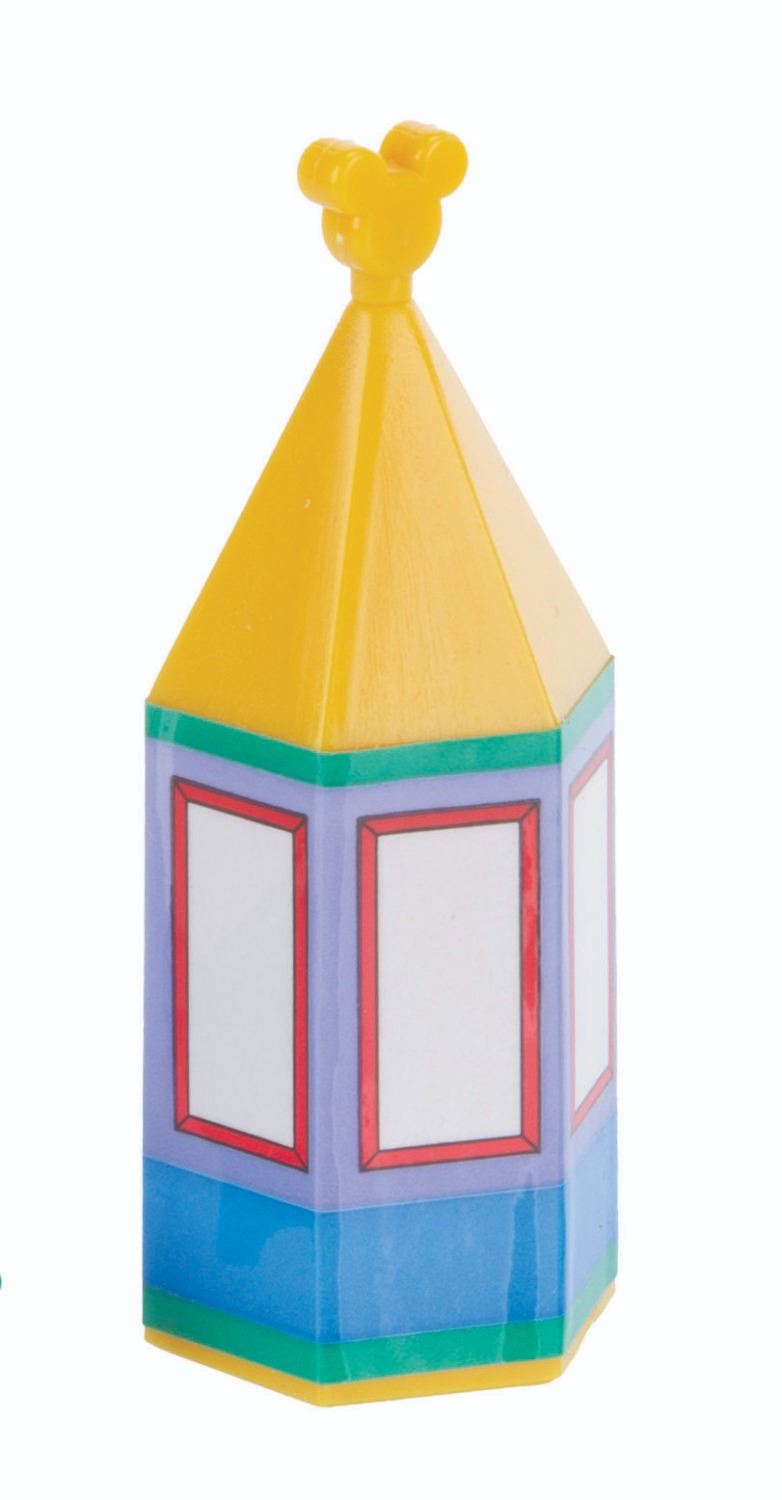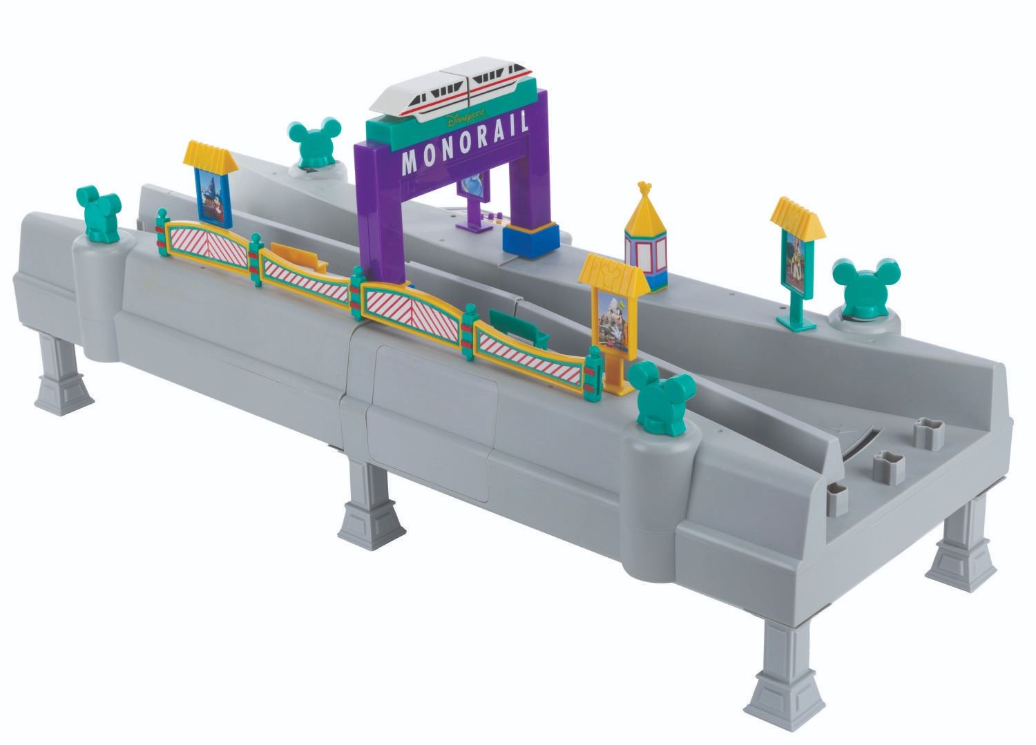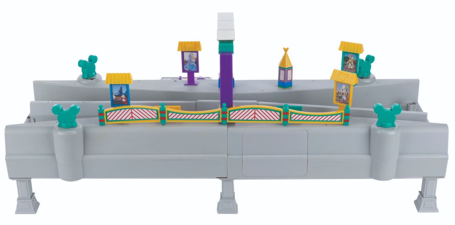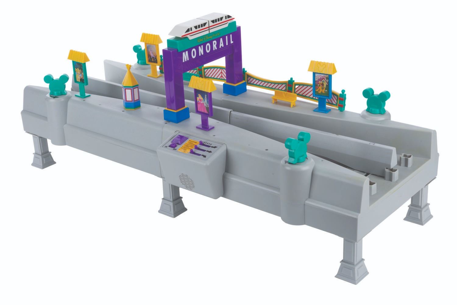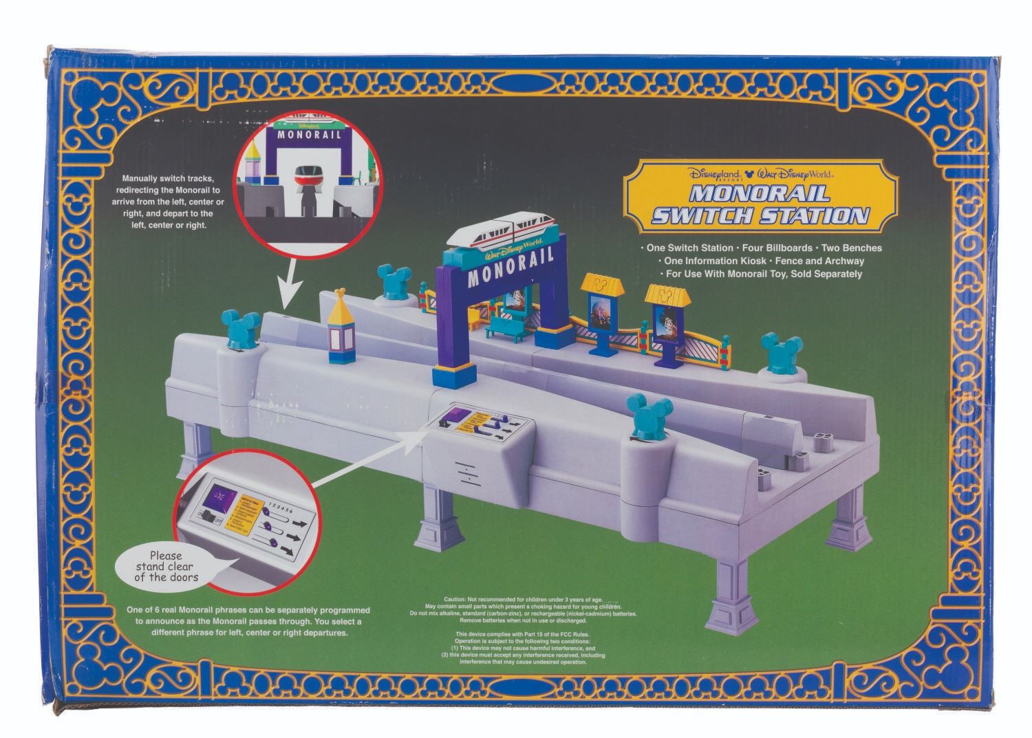 (Walt Disney World, 2000s) A Monorail Switch Station playset from the Walt Disney World Monorail Collection. With three "AA" batteries (not included), the station says one of six phrases announcing different destinations at the Walt Disney World Resort. The set is complete in the original box with all accessories, and the two 13" x 10" x 5.75" high track switching stations. The set is in very good working condition with very slight discoloration to spots on the switching stations from age. The box is in fair condition with warping from water exposure.