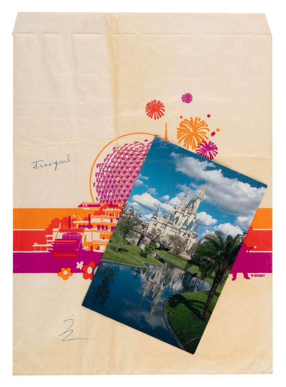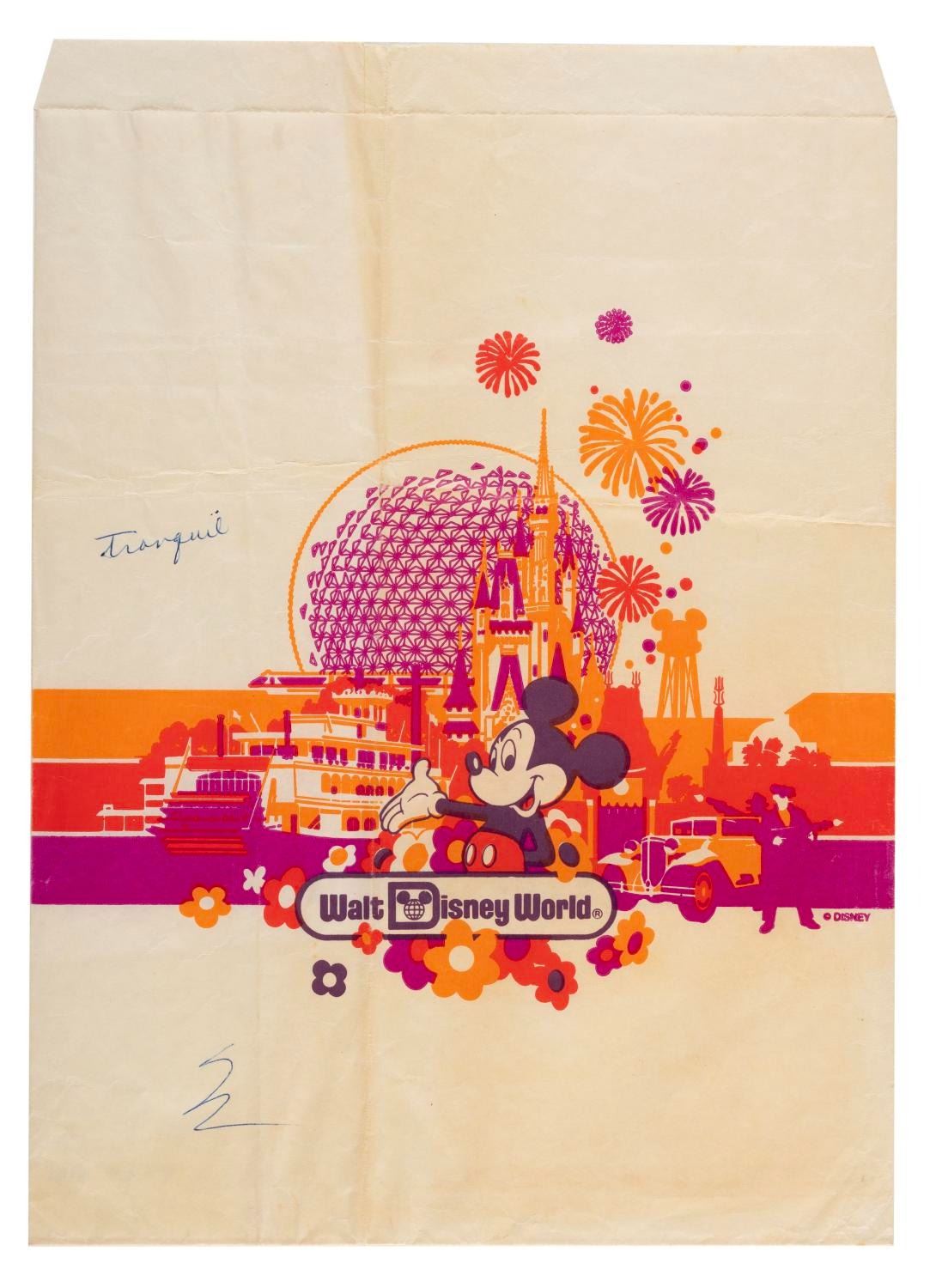 (Walt Disney World, 1980s) A souvenir postcard of Cinderella Castle and a shopping bag from Walt Disney World. The 4” x 6” postcard is in very good condition with light wear, while the 8.5” x 11.75” bag is in fair condition with ink marks, creases, and wear throughout.