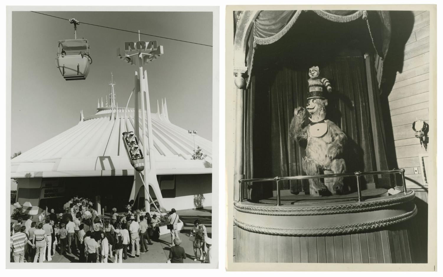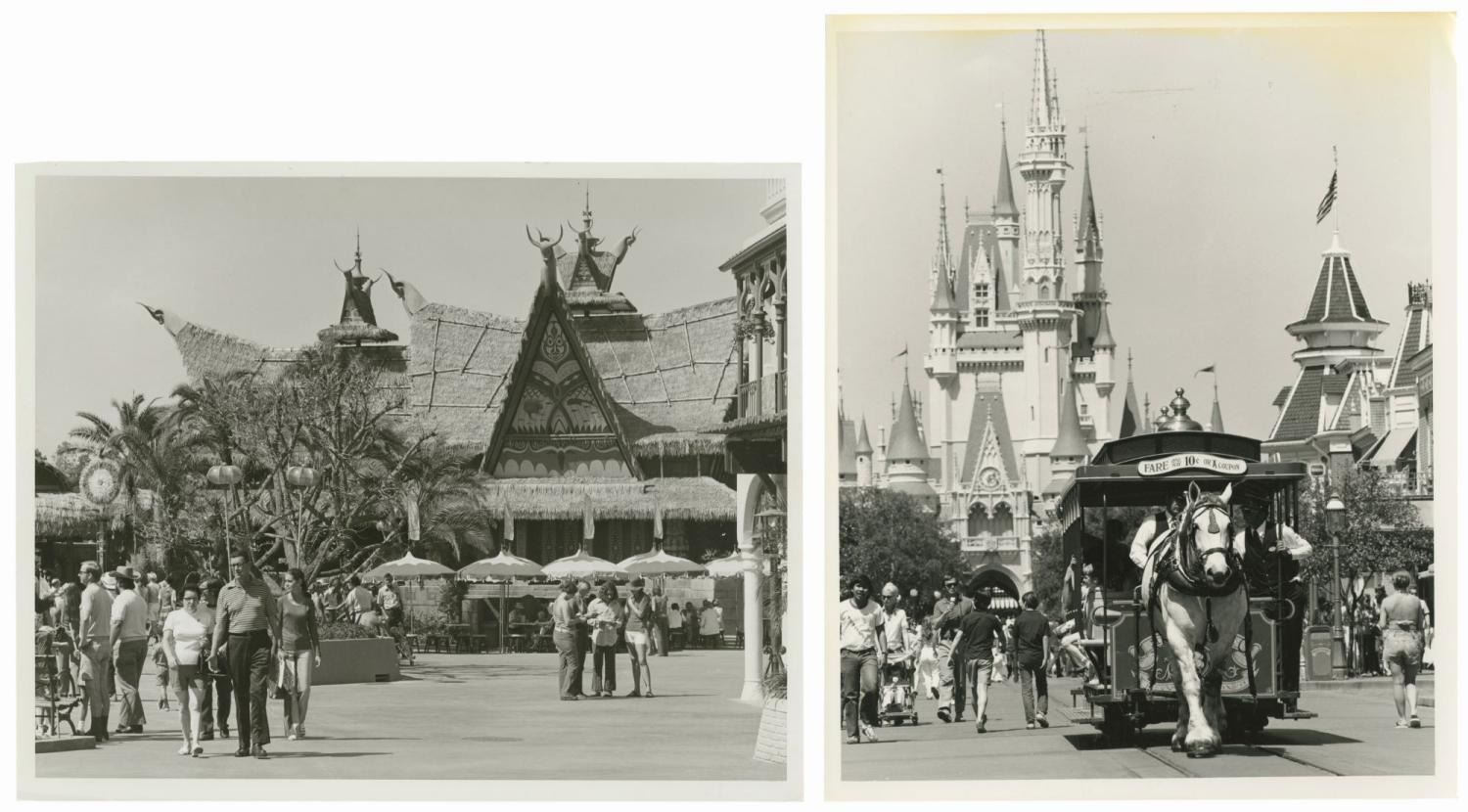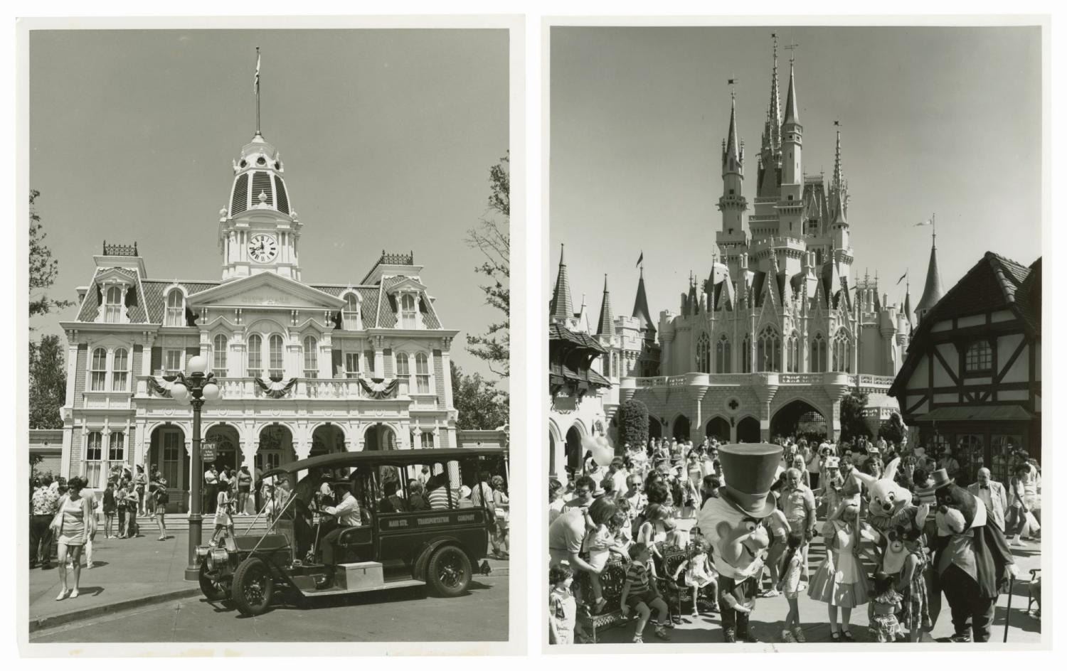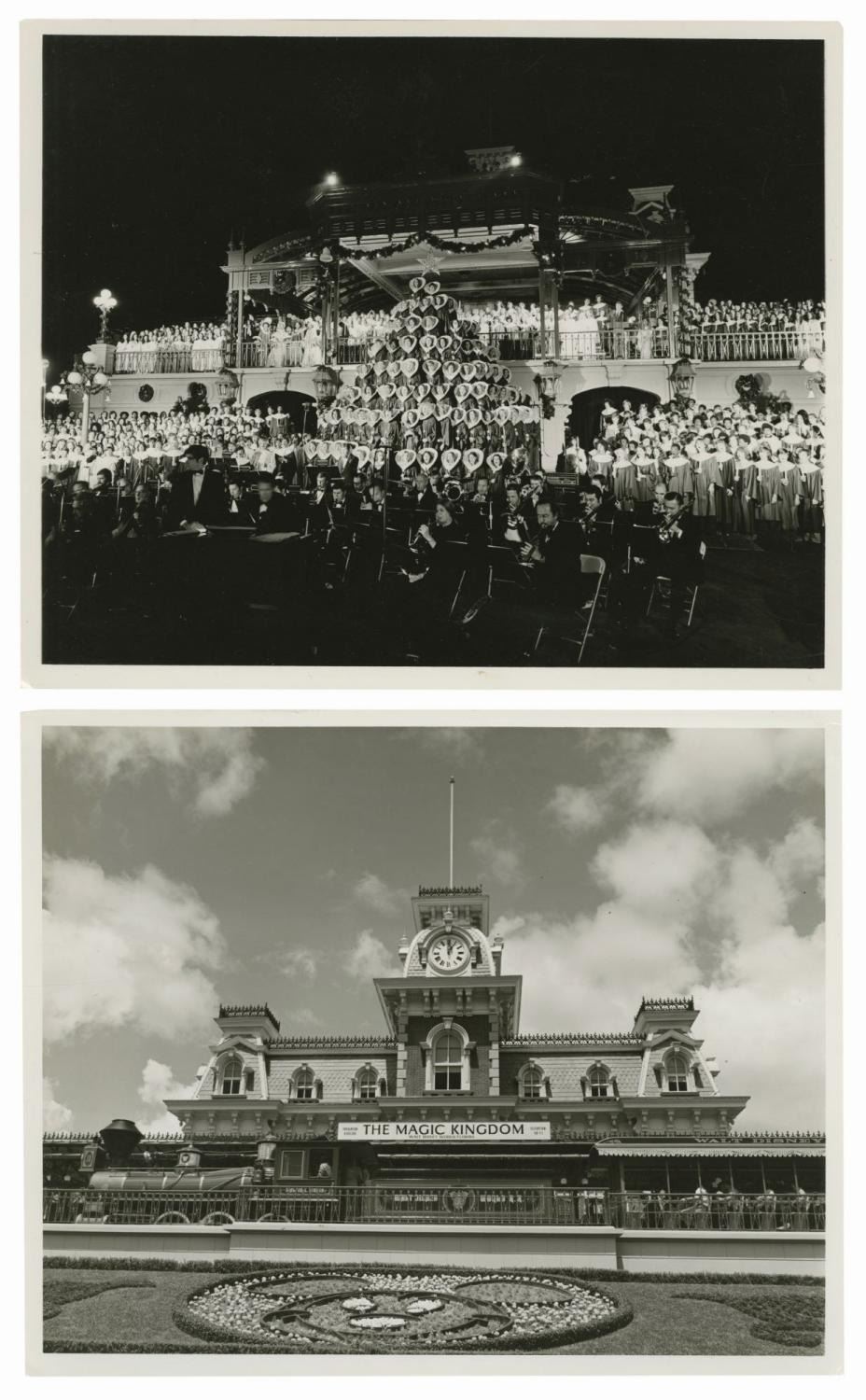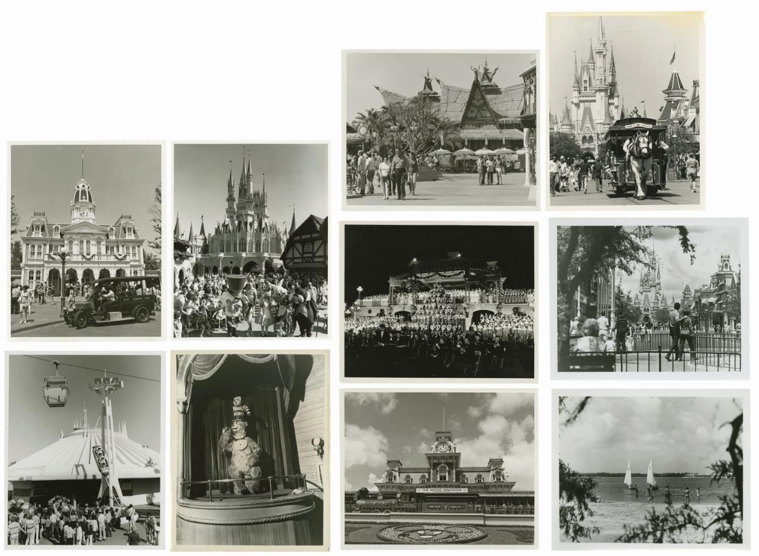 (Walt Disney World, 1971-82) A collection of ten black-and-white press photos from Walt Disney World. Included are photos of Henry from the Country Bear Jamboree, characters from "Alice in Wonderland" posing in front of Cinderella Castle, the Main Street Station, and many more Park highlights. Measuring 8" x 10" each, the set is in very good condition overall with minor edge wear, discoloration, and staining.