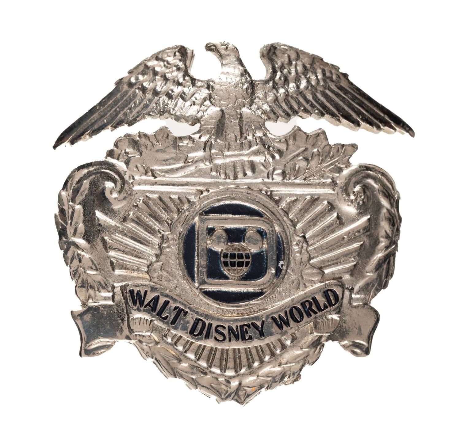 (Walt Disney World, 1970s) A badge worn by security officers at Walt Disney World, featuring the original logo. This hat badge appears to be have been adapted with a pin fixture on the back. The badge measures 1.75"x2" and is in very good condition with some expected wear from age and use.