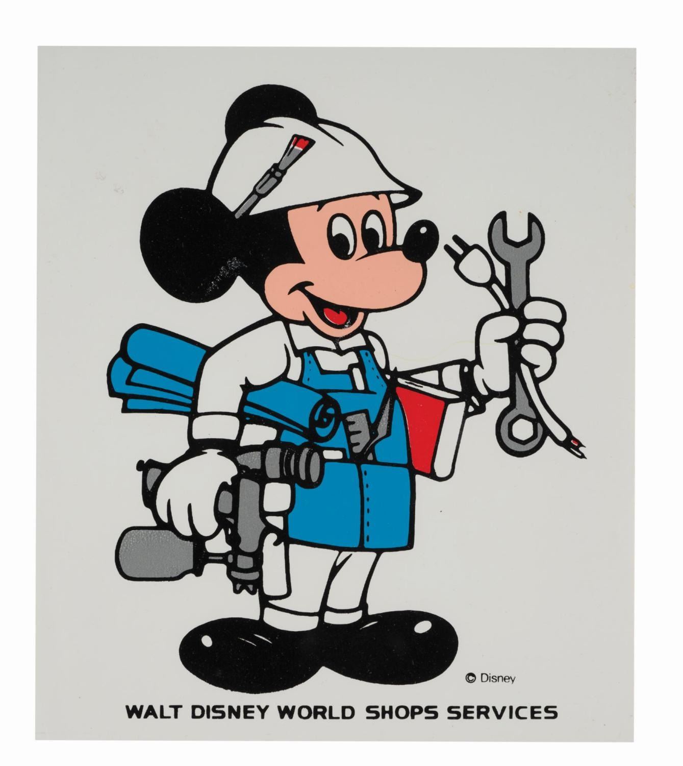 (Walt Disney World, 1980s-90s) A Walt Disney World Shops Services sticker used to identify equipment belonging to the division. This unused sticker represents the Backstage Division responsible for installations, maintenance, and repairs. Measuring 6" x 7", this sticker is in very good condition with faint creases and minor wear.