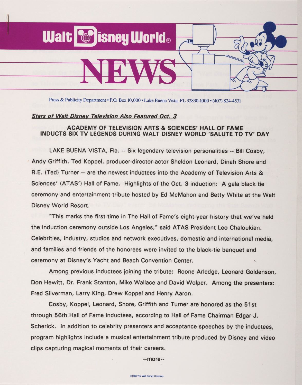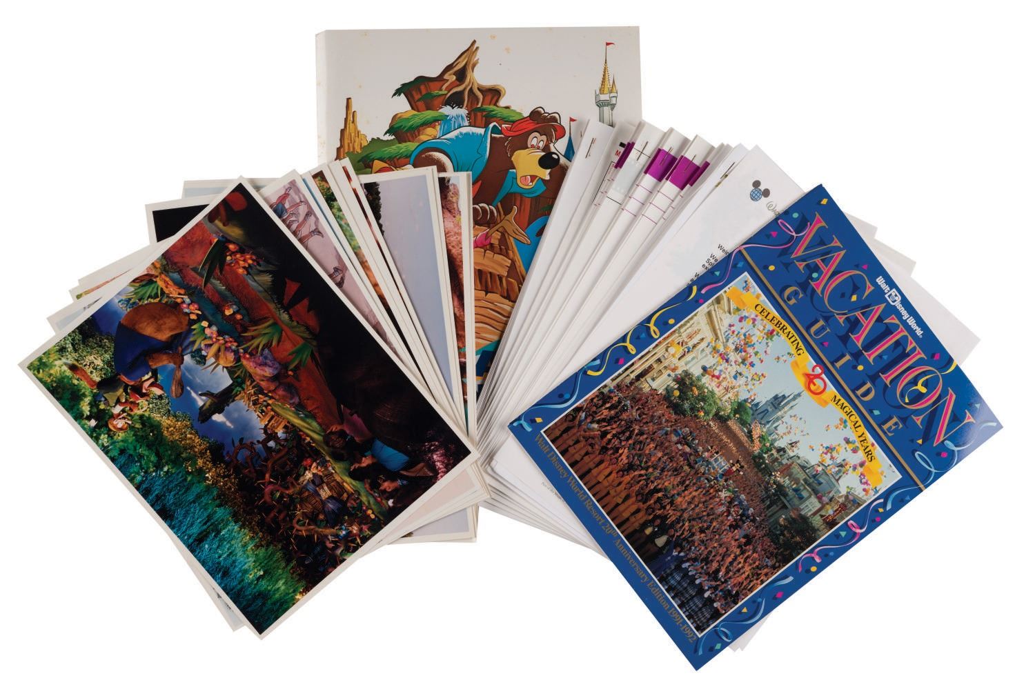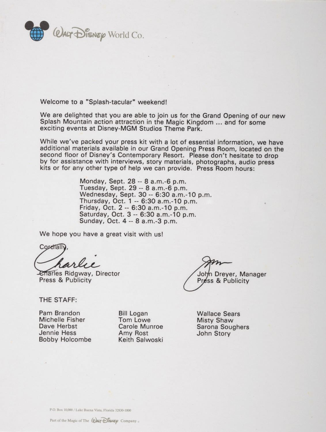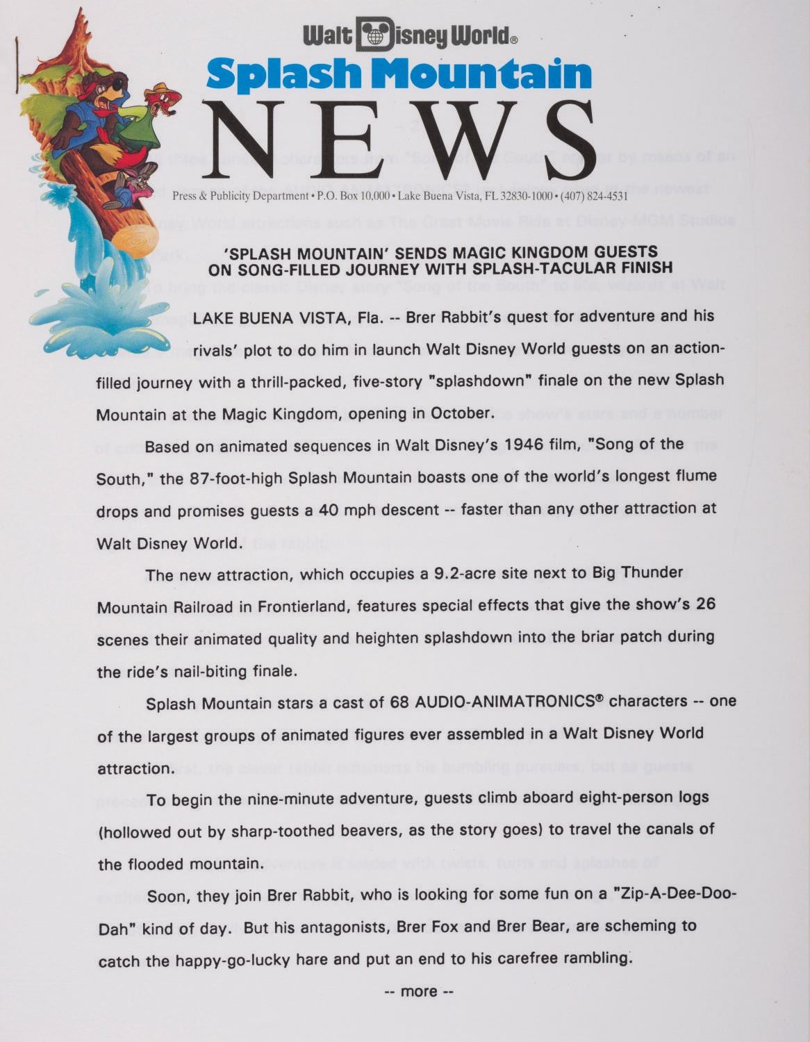 (Walt Disney World, 1988) A "Walt Disney World News" press kit announcing the opening of Splash Mountain and contemporaneous events at Walt Disney World Resort. The folder and contents were prepared by The Walt Disney World Company Press & Publicity Department, exclusively for media member attendees. Among the materials are (1) introductory letter (2) "Splash Mountain News," (6) "Walt Disney World News," (1) "News From Disney-MGM Studios," (1) "Facts on Prices" sheet, (1) "Walt Disney World Operating Calendar," a commemorative edition of Vacation Guide, (10) promotional photos, and (3) additional informational packs. The contents come packaged within a 9"x12" commemorative Splash Mountain folder and are in good condition with minor wear from handling and age.