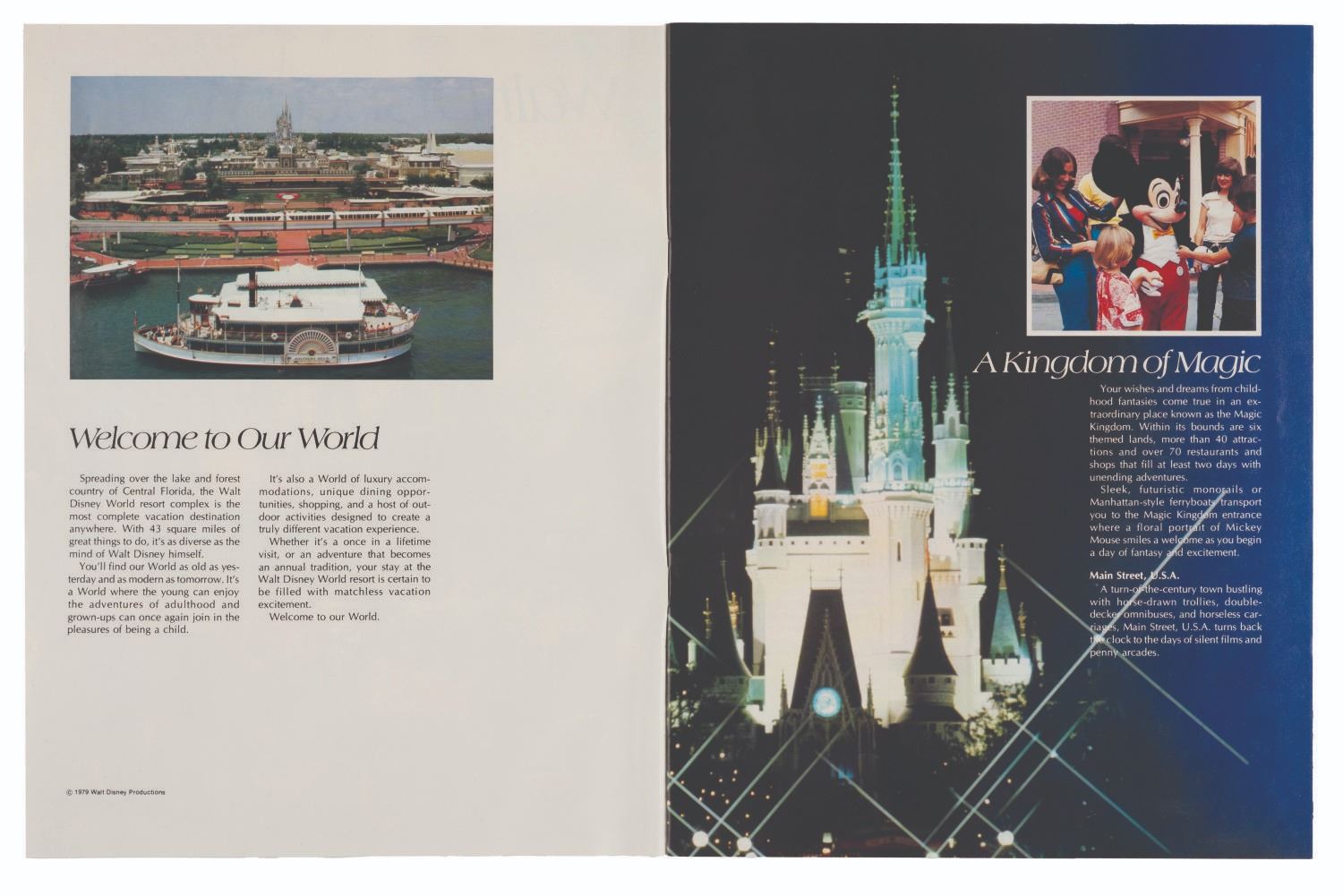 (Walt Disney World, 1979) A Vacation Guide to Walt Disney World, focused on the exciting amenities available throughout the Resort. Measuring 8.5" x 11", the guide is in very good condition with light creases and handling wear.